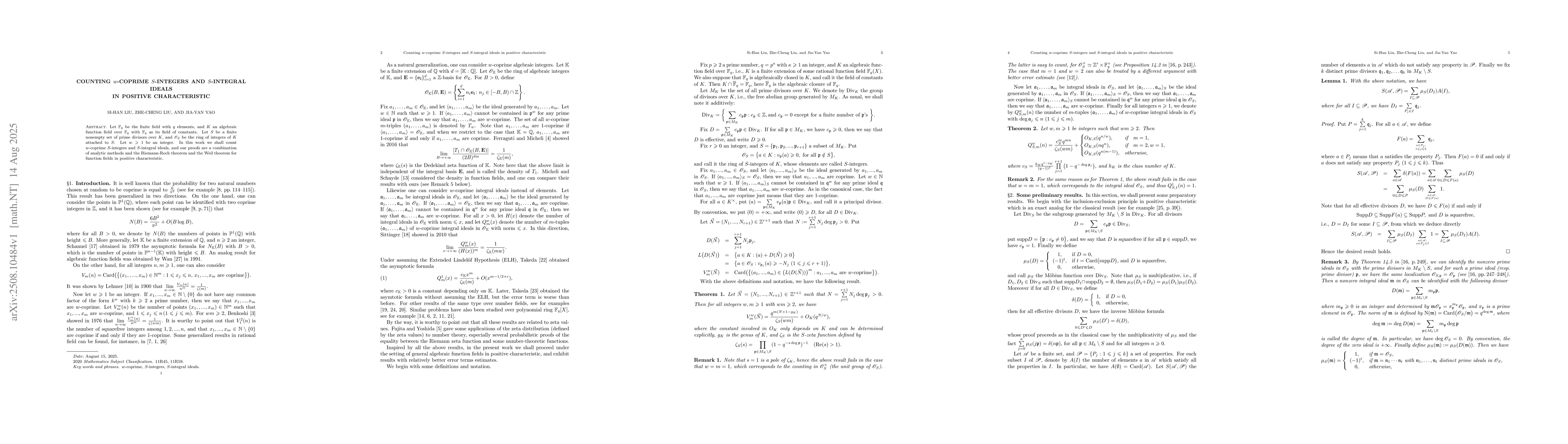 Let Fq be the finite field with q elements, and K an algebraic function field over with Fq as its field of constants. Let S be a finite nonempty set of prime divisors over K, and OS be the ring of integers of K attached to S. Let w greater than 1 be an integer. In this work we shall count w coprime S integers and S integral ideals, and our proofs are a combination of analytic methods and the Riemann Roch theorem and the Weil theorem for function fields in positive characteristic.