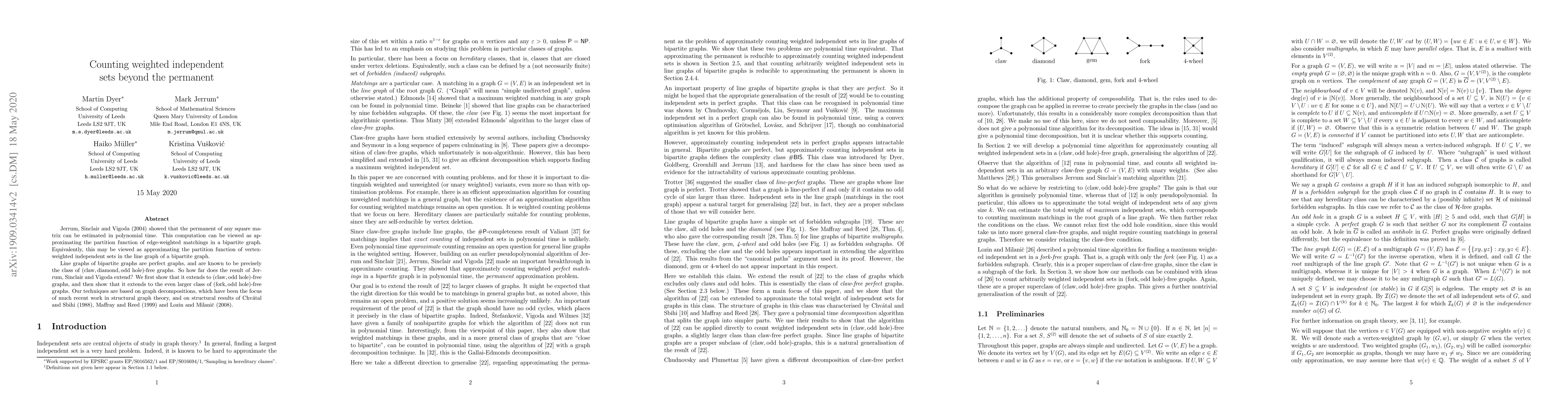 Jerrum, Sinclair and Vigoda (2004) showed that the permanent of any square matrix can be estimated in polynomial time. This computation can be viewed as approximating the partition function of edge-weighted matchings in a bipartite graph. Equivalently, this may be viewed as approximating the partition function of vertex-weighted independent sets in the line graph of a bipartite graph. Line graphs of bipartite graphs are perfect graphs, and are known to be precisely the class of (claw, diamond, odd hole)-free graphs. So how far does the result of Jerrum, Sinclair and Vigoda extend? We first show that it extends to (claw, odd hole)-free graphs, and then show that it extends to the even larger class of (fork, odd hole)-free graphs. Our techniques are based on graph decompositions, which have been the focus of much recent work in structural graph theory, and on structural results of Chvatal and Sbihi (1988), Maffray and Reed (1999) and Lozin and Milanic (2008).