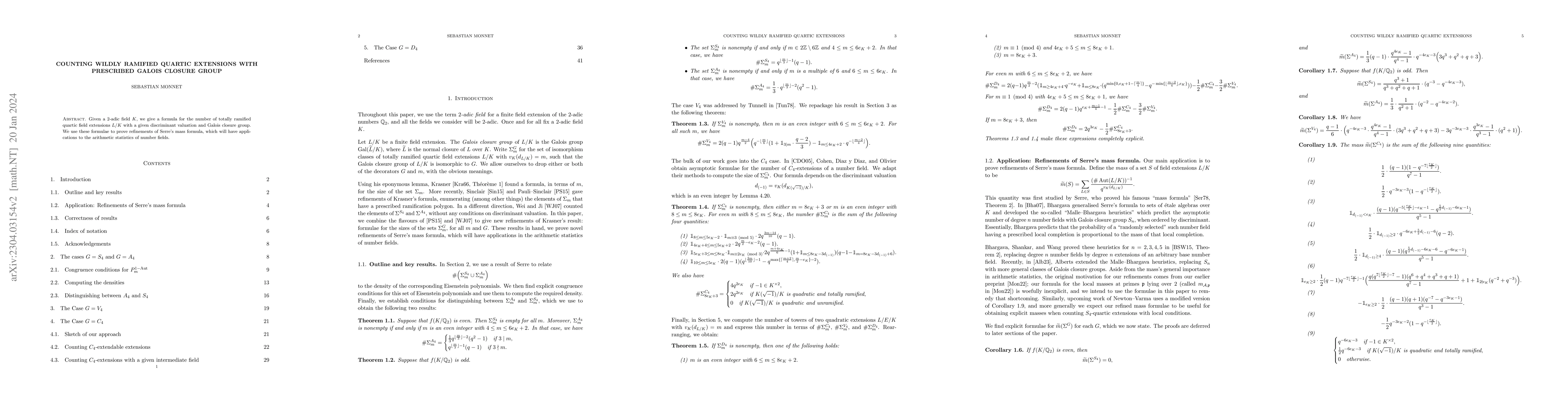 Given a $2$-adic field $K$, we give formulae for the number of totally ramified quartic field extensions $L/K$ with a given discriminant valuation and Galois closure group. We use these formulae to prove a refinement of Serre's mass formula, which will have applications to the arithmetic statistics of number fields.