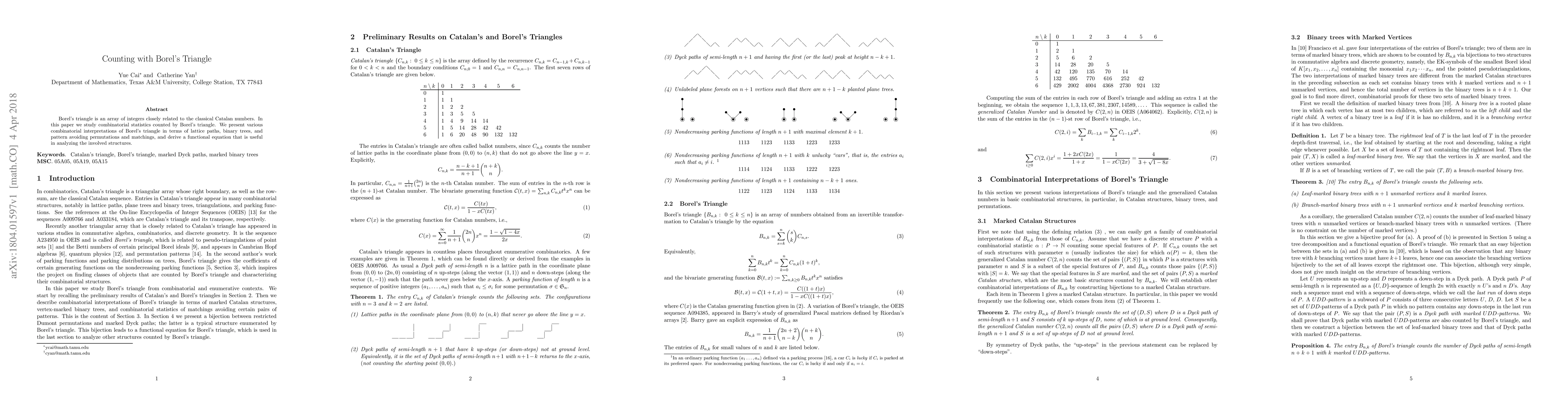 This paper investigates Borel's triangle, a combinatorial structure closely related to Catalan numbers, through various interpretations in lattice paths, binary trees, and pattern avoiding permutations and matchings. It derives a functional equation to analyze the involved structures, shedding light on its statistical properties.