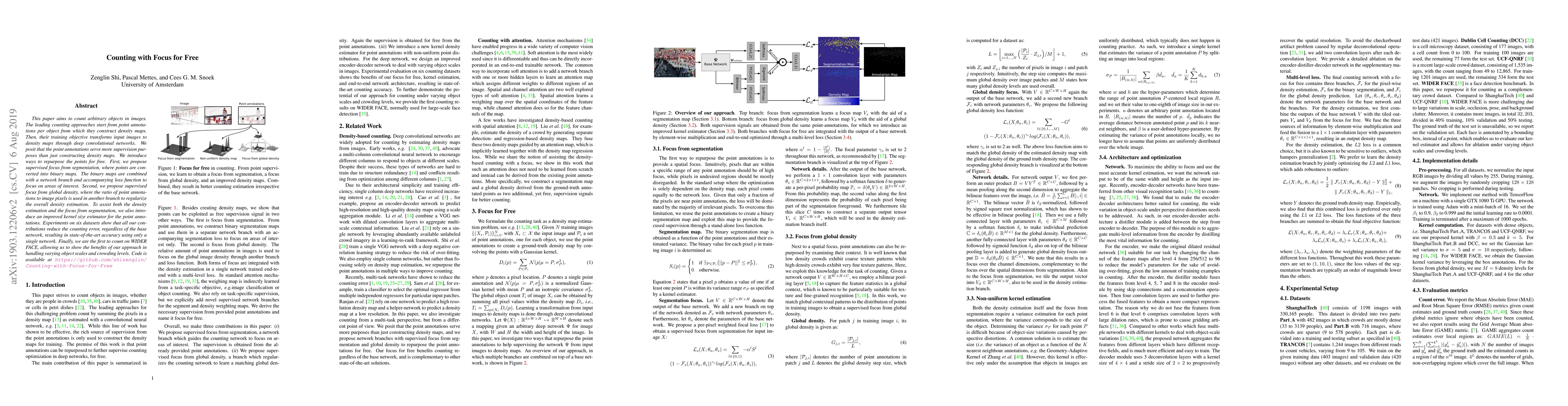 This paper aims to count arbitrary objects in images. The leading counting approaches start from point annotations per object from which they construct density maps. Then, their training objective transforms input images to density maps through deep convolutional networks. We posit that the point annotations serve more supervision purposes than just constructing density maps. We introduce ways to repurpose the points for free. First, we propose supervised focus from segmentation, where points are converted into binary maps. The binary maps are combined with a network branch and accompanying loss function to focus on areas of interest. Second, we propose supervised focus from global density, where the ratio of point annotations to image pixels is used in another branch to regularize the overall density estimation. To assist both the density estimation and the focus from segmentation, we also introduce an improved kernel size estimator for the point annotations. Experiments on six datasets show that all our contributions reduce the counting error, regardless of the base network, resulting in state-of-the-art accuracy using only a single network. Finally, we are the first to count on WIDER FACE, allowing us to show the benefits of our approach in handling varying object scales and crowding levels. Code is available at https://github.com/shizenglin/Counting-with-Focus-for-Free