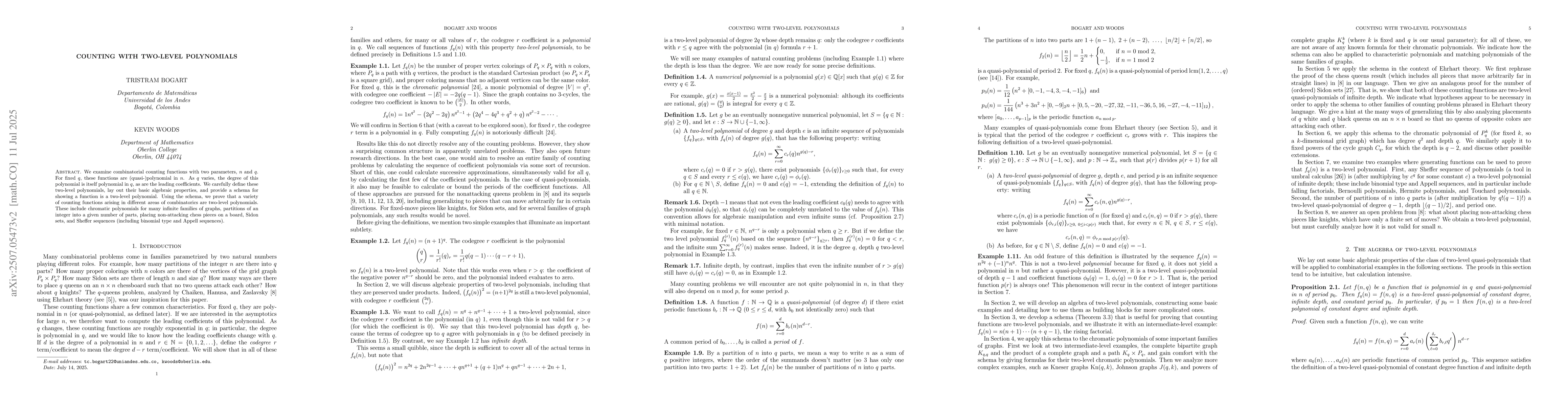 We examine combinatorial counting functions with two parameters, $n$ and $q$. For fixed $q$, these functions are (quasi-)polynomial in $n$. As $q$ varies, the degree of this polynomial is itself polynomial in $q$, as are the leading coefficients. We carefully define these two-level polynomials, lay out their basic algebraic properties, and provide a schema for showing a function is a two-level polynomial. Using the schema, we prove that a variety of counting functions arising in different areas of combinatorics are two-level polynomials. These include chromatic polynomials for many infinite families of graphs, partitions of an integer into a given number of parts, placing non-attacking chess pieces on a board, Sidon sets, and Sheffer sequences (including binomial type and Appell sequences).