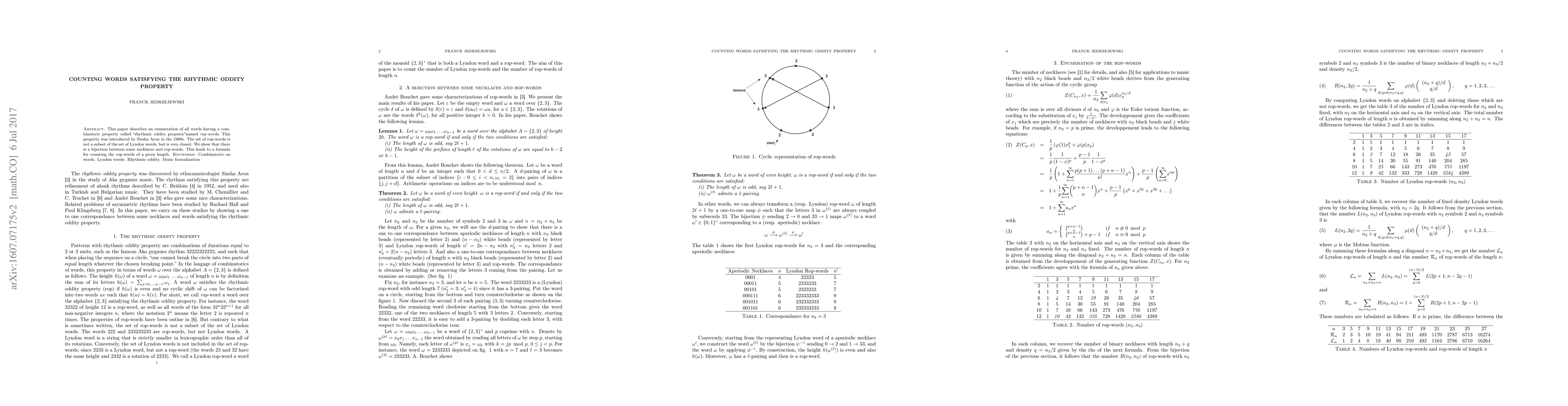 This paper describes an enumeration of all words having a combinatoric property called "rhythmic oddity property"named \emph{rop-words}.\ This property was introduced by Simha Aron in the 1990s. The set of rop-words is not a subset of the set of Lyndon words, but is very closed. We show that there is a bijection between some necklaces and rop-words. This leads to a formula for counting the rop-words of a given length. \textsc{Keywords:} Combinatoric on words. Lyndon words. Rhythmic oddity. Music formalization