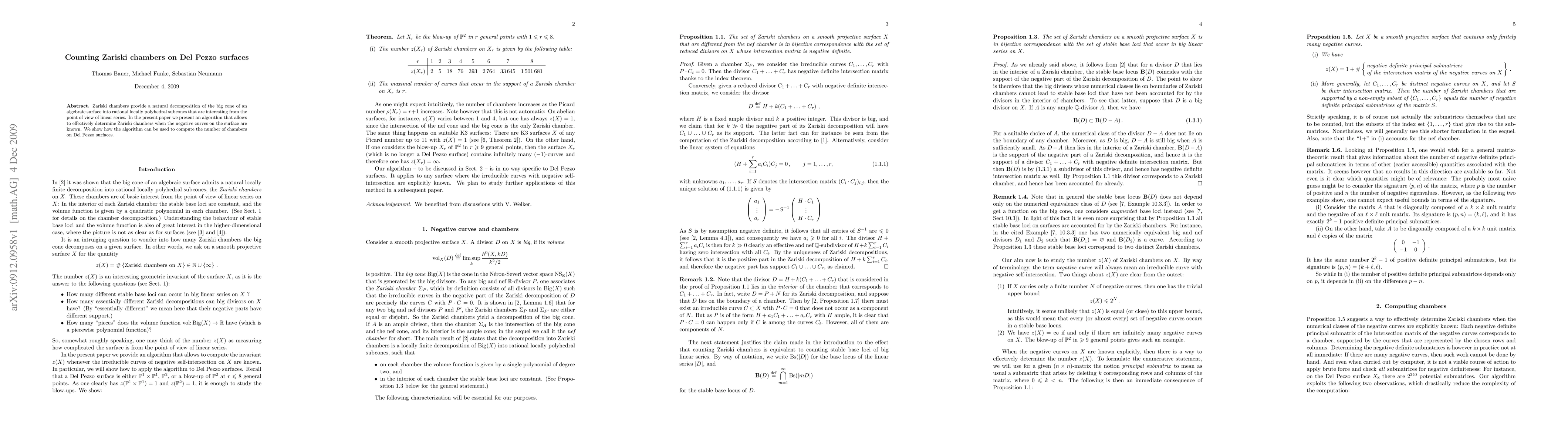 This paper presents an algorithm for determining Zariski chambers on algebraic surfaces, specifically for Del Pezzo surfaces, using known negative curves. It demonstrates the application of this algorithm to compute the number of Zariski chambers.