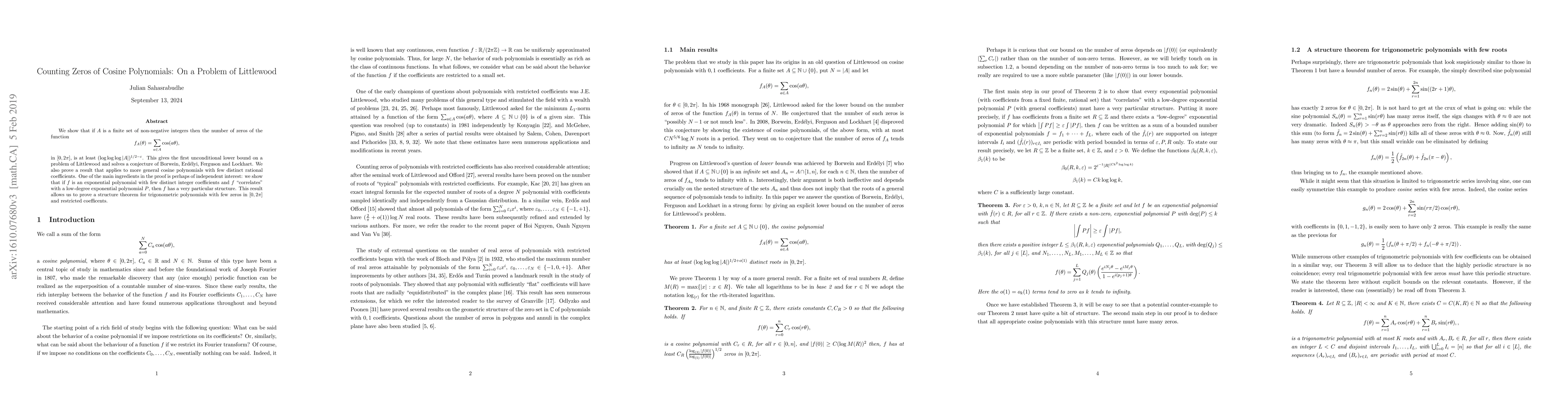 We show that if $A$ is a finite set of non-negative integers then the number of zeros of the function \[ f_A(\theta) = \sum_{a \in A} \cos(a\theta), \] in $[0,2\pi]$, is at least $(\log \log \log |A|)^{1/2-\varepsilon}$. This gives the first unconditional lower bound on a problem of Littlewood, solves a conjecture of Borwein, Erd\'elyi, Ferguson and Lockhart and improves upon work of Borwein and Erd\'elyi. We also prove a result that applies to more general cosine polynomials with "few" distinct rational coefficients. One of the main ingredients in the proof is perhaps of independent interest: we show that if $f$ is an exponential polynomial with "few" distinct integer coefficients and $f$ "correlates" with a low-degree exponential polynomial $P$, then $f$ has a very particular structure.