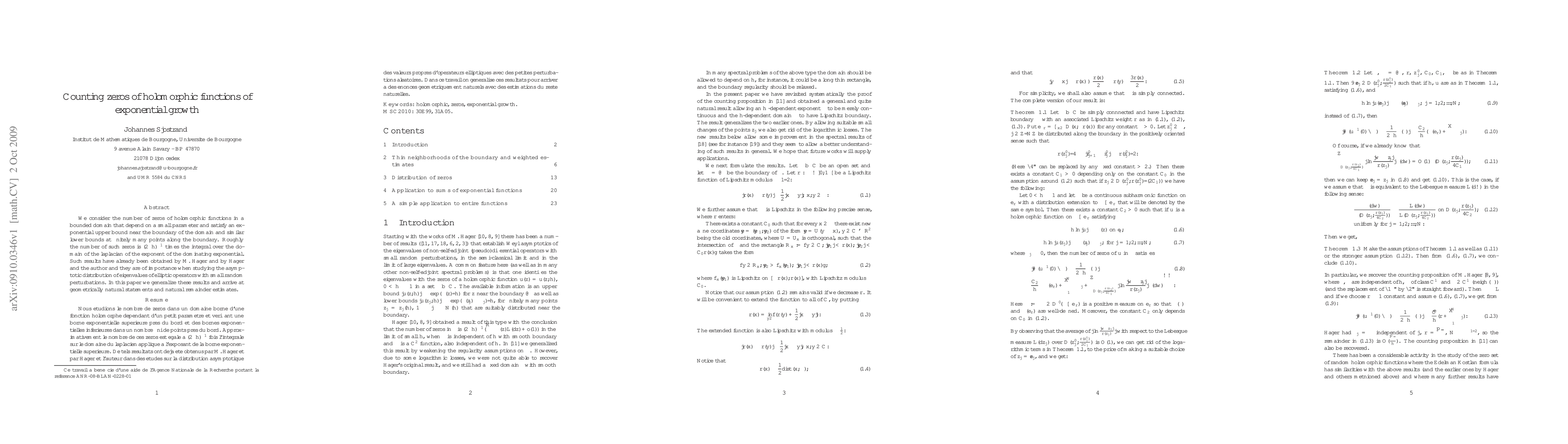 This paper generalizes previous results on counting zeros of holomorphic functions of exponential growth within a bounded domain, providing a formula that relates the number of zeros to the integral of the Laplacian of the exponent of the dominating exponential. The findings are significant for studying the asymptotic distribution of eigenvalues of elliptic operators with small random perturbations.