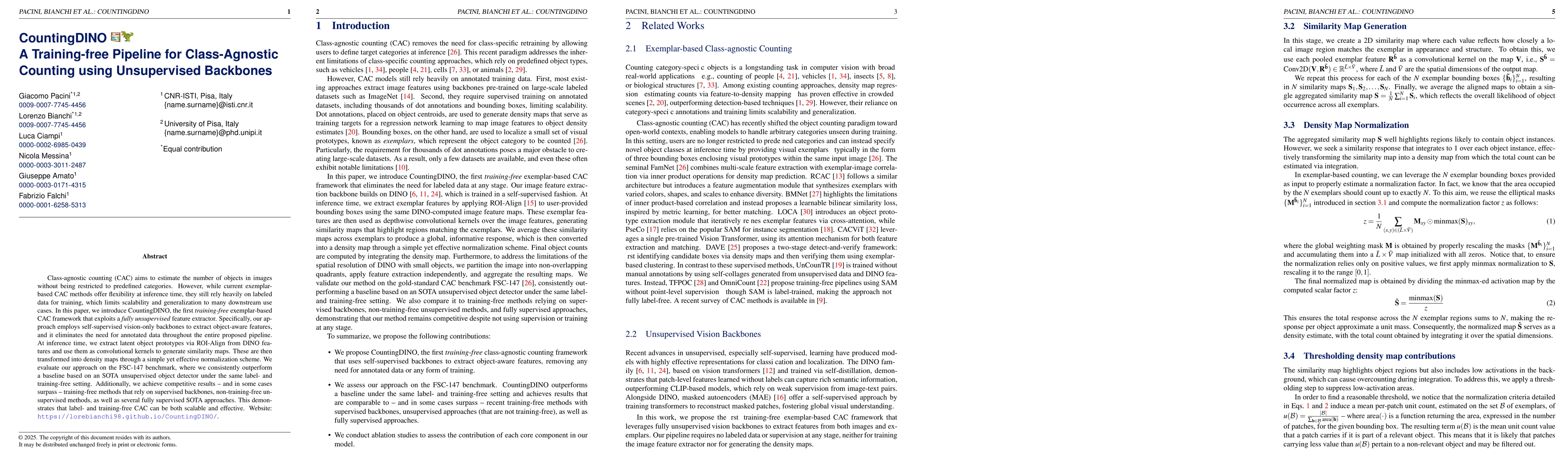 CountingDINO presents a novel training-free framework for class-agnostic counting using unsupervised self-supervised vision backbones, achieving competitive results against supervised and other unsupervised methods on the FSC-147 benchmark. The method extracts object prototypes via ROI-Align and generates density maps for counting without requiring labeled data.