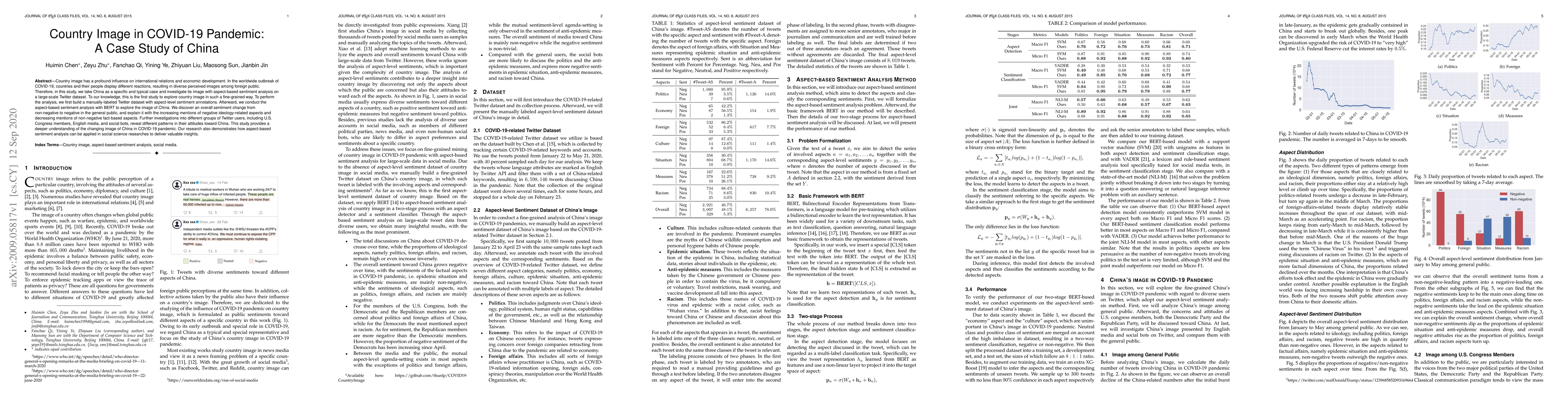 This study employs aspect-based sentiment analysis on Twitter data to examine changes in China's country image during the COVID-19 pandemic, revealing a shift from non-negative to negative sentiment due to increasing negative ideological mentions. The research highlights differing attitudes among U.S. Congress members, English media, and social bots, offering valuable insights into the dynamics of international perceptions during the pandemic.