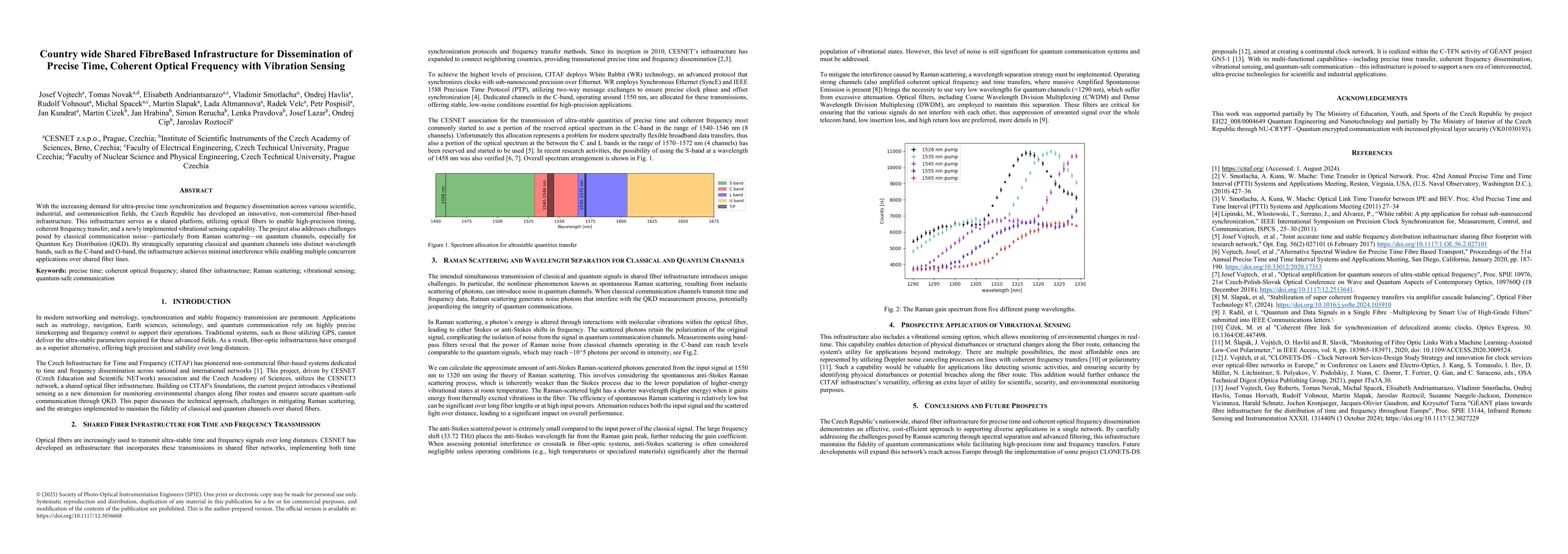 The paper describes the development of a fiber-based infrastructure in the Czech Republic for precise time synchronization, coherent optical frequency dissemination, and vibration sensing across various fields.