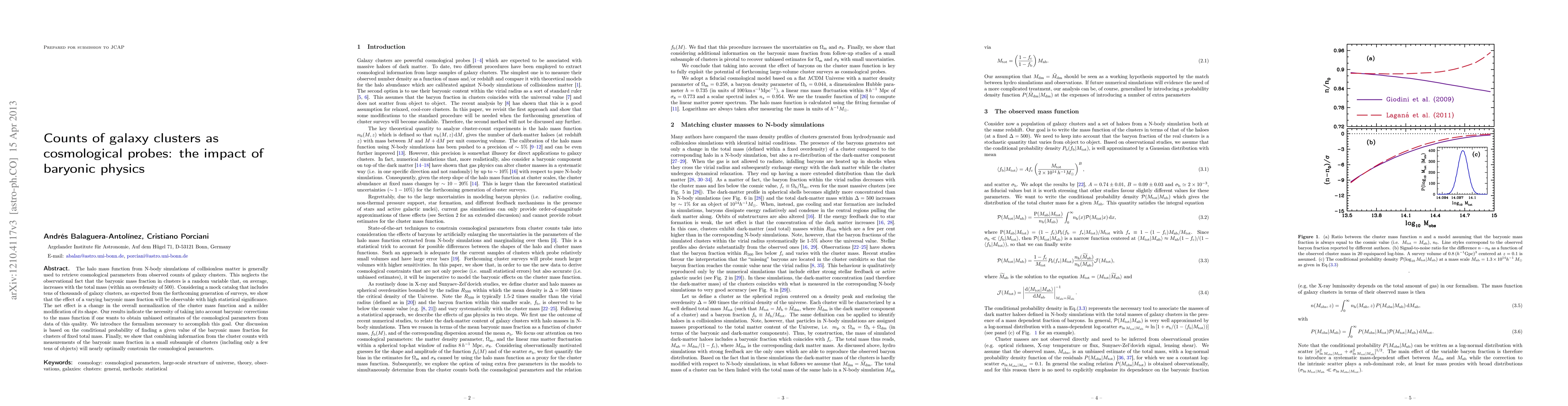This paper demonstrates that the baryonic mass fraction in galaxy clusters significantly affects the cluster mass function, necessitating corrections for accurate cosmological parameter estimation. It introduces a formalism to account for these baryonic effects, showing that combining cluster counts with baryonic mass measurements in a small subsample can nearly optimally constrain cosmological parameters.