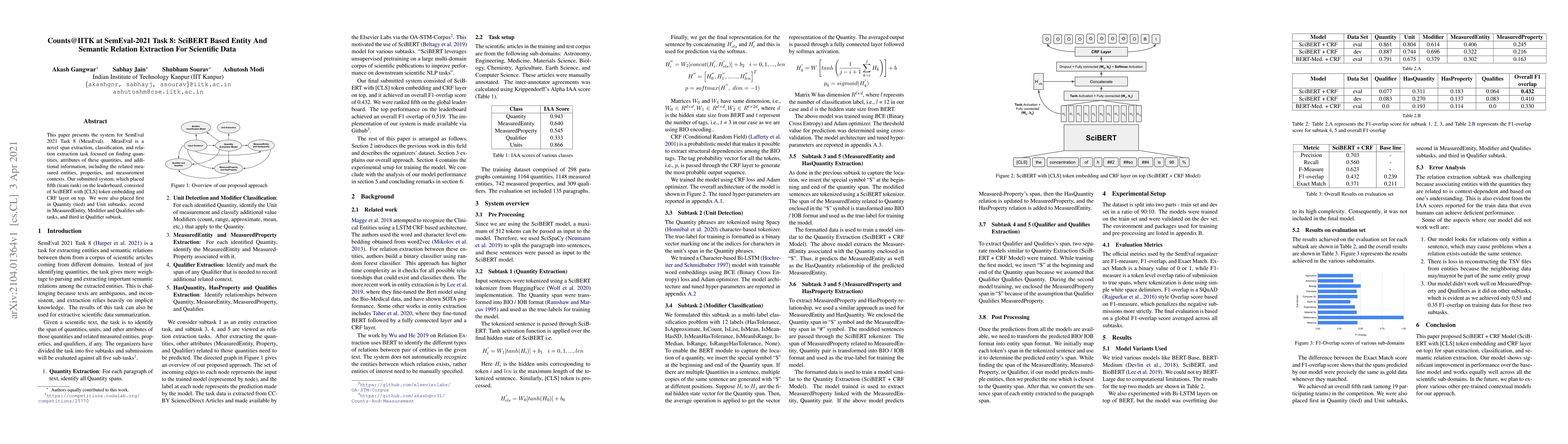 This paper presents the system for SemEval 2021 Task 8 (MeasEval). MeasEval is a novel span extraction, classification, and relation extraction task focused on finding quantities, attributes of these quantities, and additional information, including the related measured entities, properties, and measurement contexts. Our submitted system, which placed fifth (team rank) on the leaderboard, consisted of SciBERT with [CLS] token embedding and CRF layer on top. We were also placed first in Quantity (tied) and Unit subtasks, second in MeasuredEntity, Modifier and Qualifies subtasks, and third in Qualifier subtask.