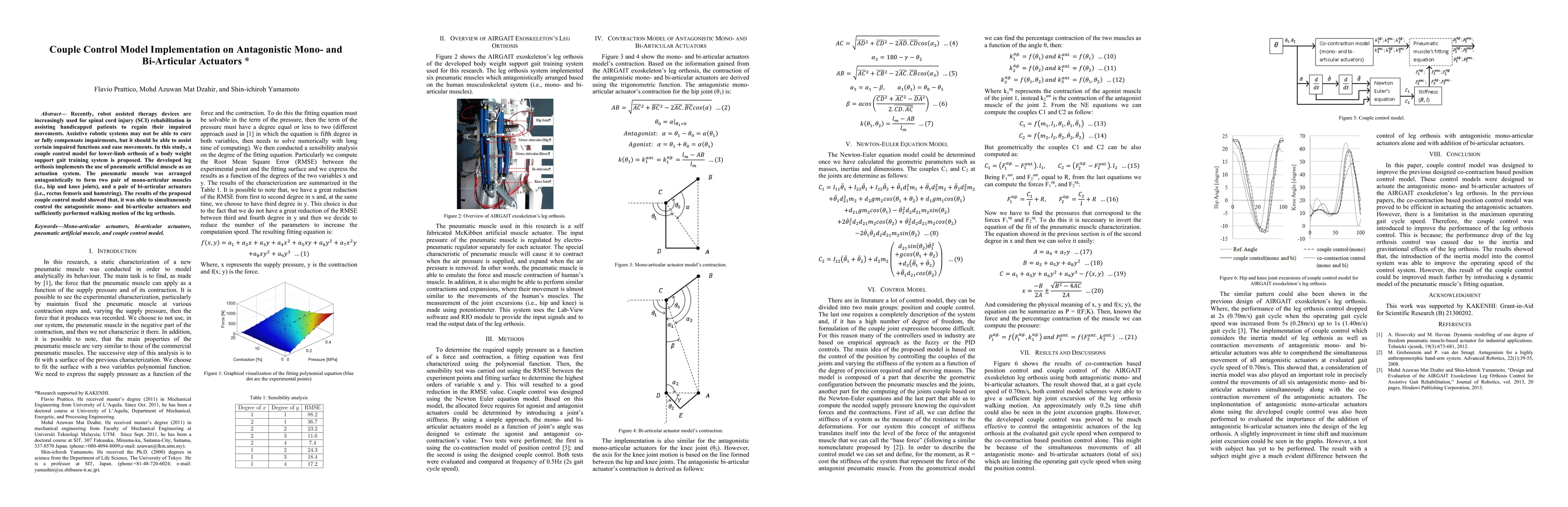 Recently, robot assisted therapy devices are increasingly used for spinal cord injury (SCI) rehabilitation in assisting handicapped patients to regain their impaired movements. Assistive robotic systems may not be able to cure or fully compensate impairments, but it should be able to assist certain impaired functions and ease movements. In this study, a couple control model for lower-limb orthosis of a body weight support gait training system is proposed. The developed leg orthosis implements the use of pneumatic artificial muscle as an actuation system. The pneumatic muscle was arranged antagonistically to form two pair of mono-articular muscles (i.e., hip and knee joints), and a pair of bi-articular actuators (i.e., rectus femoris and hamstring). The results of the proposed couple control model showed that, it was able to simultaneously control the antagonistic mono- and bi-articular actuators and sufficiently performed walking motion of the leg orthosis.