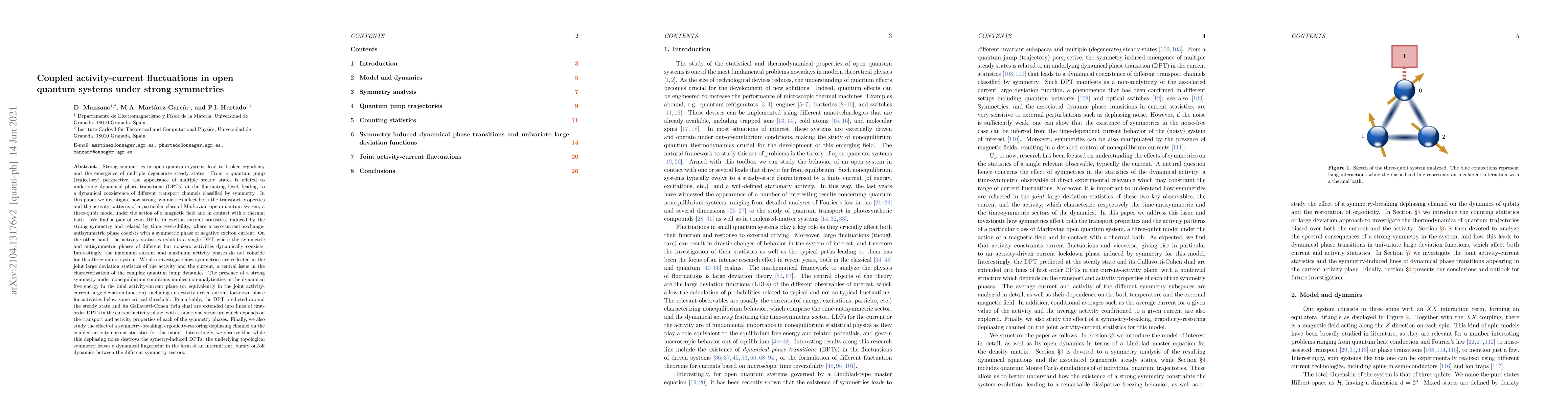 Strong symmetries in open quantum systems lead to broken ergodicity and the emergence of multiple degenerate steady states. From a quantum jump (trajectory) perspective, the appearance of multiple steady states is related to underlying dynamical phase transitions (DPTs) at the fluctuating level, leading to a dynamical coexistence of different transport channels classified by symmetry. In this paper, we investigate how strong symmetries affect both the transport properties and the activity patterns of a particular class of Markovian open quantum system, a three-qubit model under the action of a magnetic field and in contact with a thermal bath. We find a pair of twin DPTs in exciton current statistics, induced by the strong symmetry and related by time reversibility, where a zero-current exchange-antisymmetric phase coexists with a symmetric phase of negative exciton current. On the other hand, the activity statistics exhibits a single DPT where the symmetric and antisymmetric phases of different but nonzero activities dynamically coexists. The presence of a strong symmetry under non-equilibrium conditions implies non-analyticities in the dynamical free energy in the dual activity-current plane, including an activity-driven current lockdown phase for activities below some critical threshold. Finally, we also study the effect of a symmetry-breaking, ergodicity-restoring dephasing channel on the coupled activity-current statistics for this model. Interestingly, we observe that while this dephasing noise destroys the symmetry-induced DPTs, the underlying topological symmetry leaves a dynamical fingerprint in the form of intermittent, bursty on/off dynamics between the different symmetry sectors.