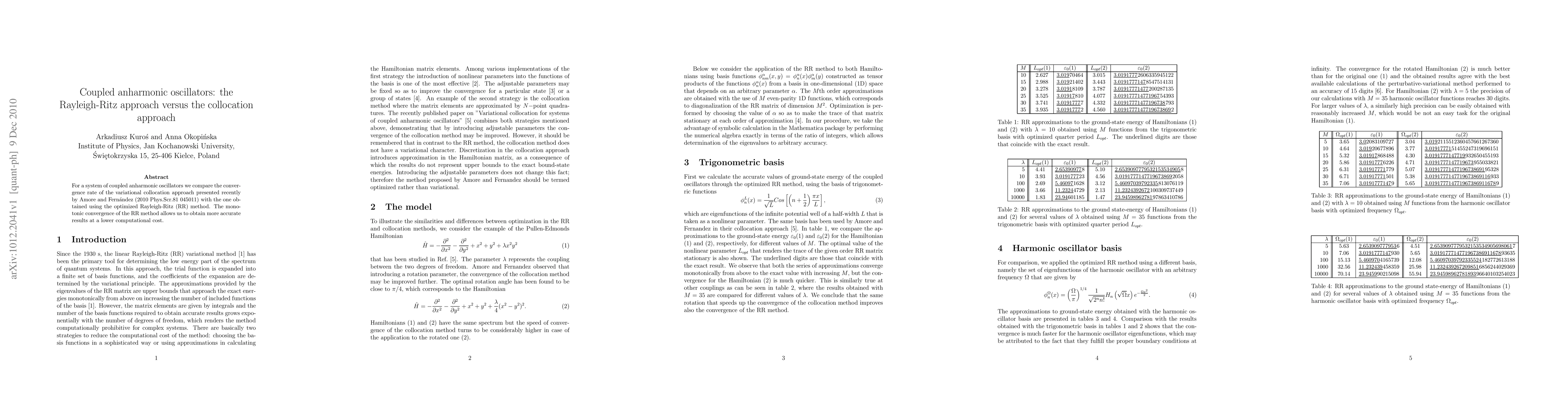 This paper compares the convergence rates of the variational collocation approach and the optimized Rayleigh-Ritz method for solving a system of coupled anharmonic oscillators, finding that the RR method provides more accurate results with lower computational costs.