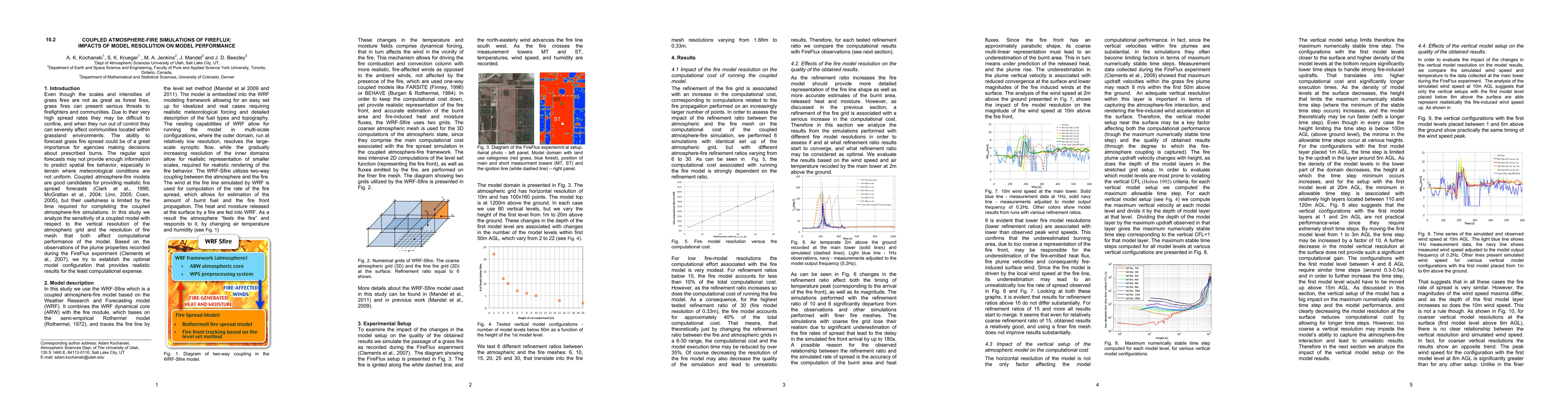 The ability to forecast grass fire spread could be of a great importance for agencies making decisions about prescribed burns. However, the usefulness of the models used for fire-spread predictions is limited by the time required for completing the coupled atmosphere-fire simulations. In this study we analyze the sensitivity of a coupled model with respect to the vertical resolution of the atmospheric grid and the resolution of fire mesh that both affect computational performance of the model. Based on the observations of the plume properties recorded during the FireFlux experiment (Clements et al., 2007), we try to establish the optimal model configuration that provides realistic results for the least computational expense.