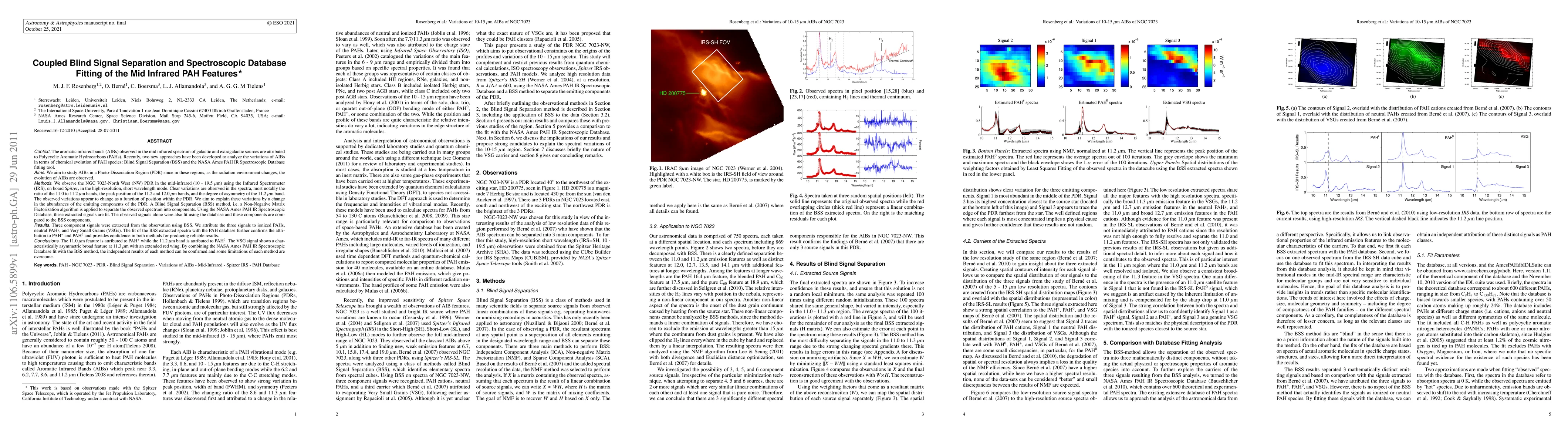 This paper uses Blind Signal Separation and spectroscopic database fitting to analyze variations in mid-infrared PAH features observed in NGC 7023-NW PDR. The study identifies three components attributed to ionized PAHs, neutral PAHs, and Very Small Grains, confirming the reliability of both methods.