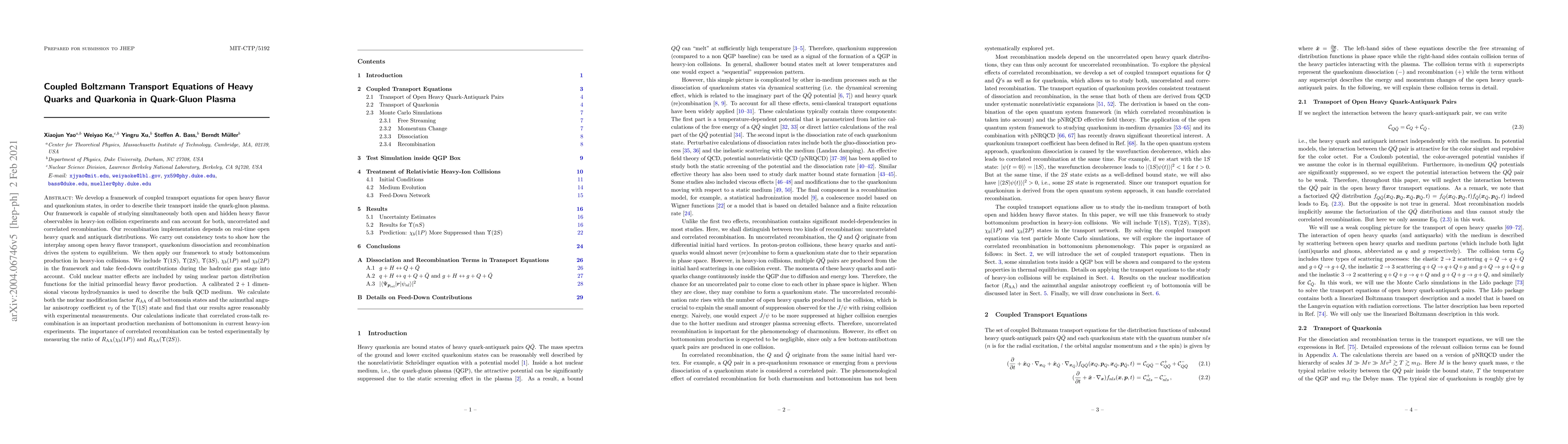 This paper develops coupled Boltzmann transport equations to study the dynamics of heavy quarks and quarkonia in quark-gluon plasma, focusing on both open and hidden heavy flavor observables. It finds that correlated recombination significantly contributes to bottomonium production, with experimental tests suggested to verify this mechanism.