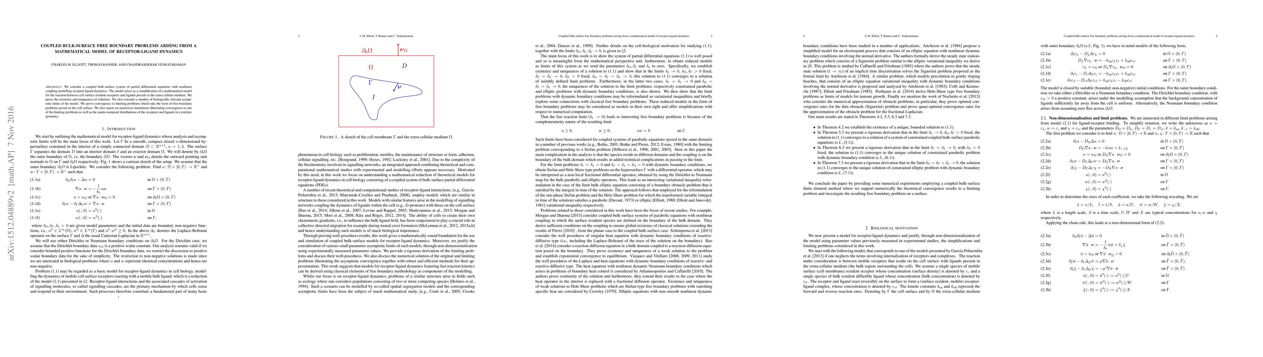 This paper models receptor-ligand dynamics with a coupled bulk-surface system of PDEs, proving the existence and uniqueness of solutions and convergence to free boundary problems on the cell surface.