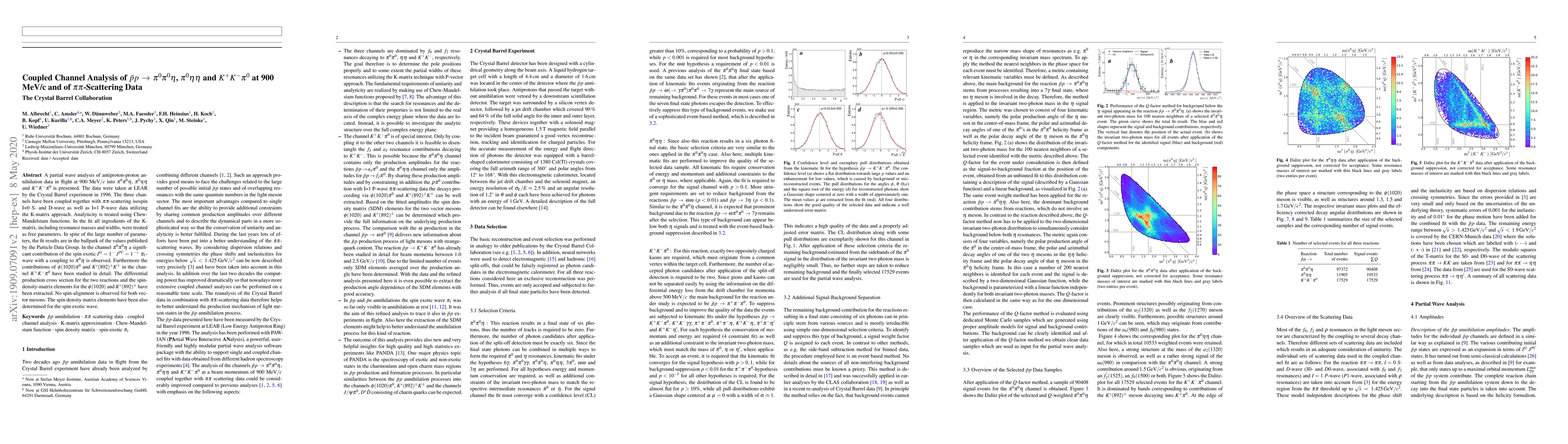 A partial wave analysis of antiproton-proton annihilation data in flight at 900 $MeV/c$ into $\pi^0 \pi^0 \eta$ , $\pi^0 \eta \eta$ and $K^+ K^- \pi^0$ is presented. The data were taken at LEAR by the Crystal Barrel experiment in 1996. The three channels have been coupled together with $\pi\pi$-scattering isospin I=0 S- and D-wave as well as I=1 P-wave data utilizing the K-matrix approach. Analyticity is treated using Chew-Mandelstam functions. In the fit all ingredients of the K-matrix, including resonance masses and widths, were treated as free parameters. In spite of the large number of parameters, the fit results are in the ballpark of the values published by the Particle Data Group. In the channel $\pi^0 \pi^0 \eta$ a significant contribution of the spin exotic $I^G=1^-$ $J^{PC}=1^{-+}$ $\pi_1$-wave with a coupling to $\pi^0 \eta$ is observed. Furthermore the contributions of $\phi(1020) \pi^0$ and $K^*(892)^\pm K^\mp$ in the channel $K^+ K^- \pi^0$ have been studied in detail. The differential production cross section for the two reactions and the spin-density-matrix elements for the $\phi(1020)$ and $K^*(892)^\pm$ have been extracted. No spin-alignment is observed for both vector mesons. The spin density matrix elements have been also determined for the spin exotic wave.