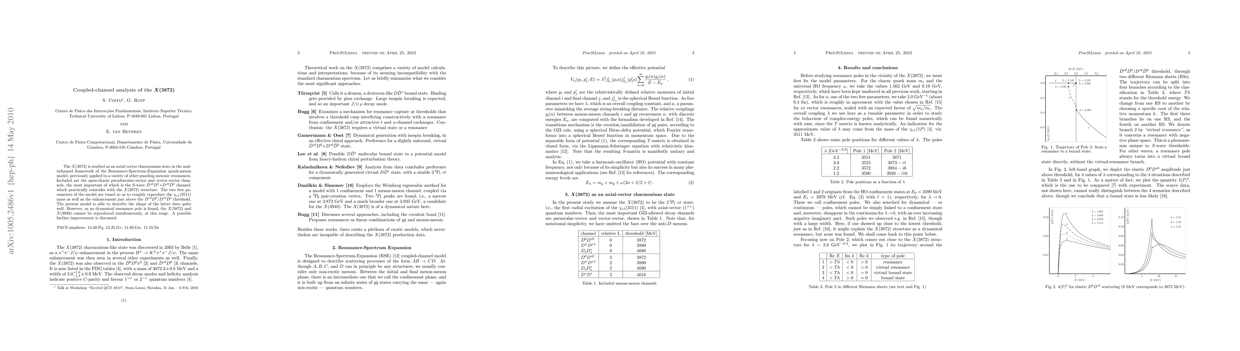 The X(3872) is studied as an axial-vector charmonium state in the multichannel framework of the Resonance-Spectrum-Expansion quark-meson model, previously applied to a variety of other puzzling mesonic resonances. Included are the open-charm pseudoscalar-vector and vector-vector channels, the most important of which is the S-wave $\bar{D}^{*0}D^{0}$ + $D^{*0}\bar{D}^{0}$ channel, which practically coincides with the X(3872) structure. The two free parameters of the model are tuned so as to roughly reproduce the $\chi_{c1}(3511)$ mass as well as the enhancement just above the $\bar{D}^{*0}D^{0}$ / $D^{*0}\bar{D}^{0}$ threshold. The present model is able to describe the shape of the latter data quite well. However, as no dynamical resonance pole is found, the X(3872) and X(3940) cannot be reproduced simultaneously, at this stage. A possible further improvement is discussed.