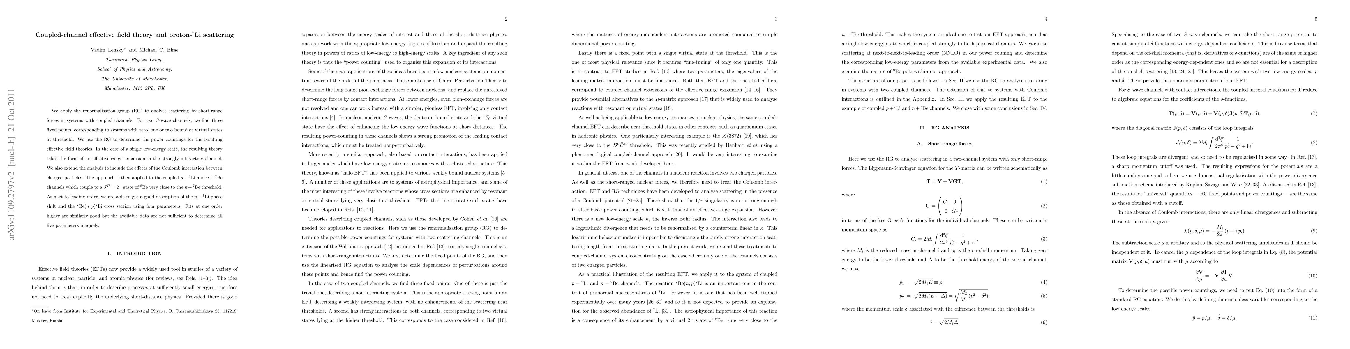 We apply the renormalisation group (RG) to analyse scattering by short-range forces in systems with coupled channels. For two S-wave channels, we find three fixed points, corresponding to systems with zero, one or two bound or virtual states at threshold. We use the RG to determine the power countings for the resulting effective field theories. In the case of a single low-energy state, the resulting theory takes the form of an effective-range expansion in the strongly interacting channel. We also extend the analysis to include the effects of the Coulomb interaction between charged particles. The approach is then applied to the coupled $p+{^7}$Li and $n+{^7}$Be channels which couple to a $J^P=2^-$ state of $^8$Be very close to the $n+{^7}$Be threshold. At next-to-leading order, we are able to get a good description of the $p+{^7}$Li phase shift and the ${^7}$Be(n,p)${^7}$Li cross section using four parameters. Fits at one order higher are similarly good but the available data are not sufficient to determine all five parameters uniquely.