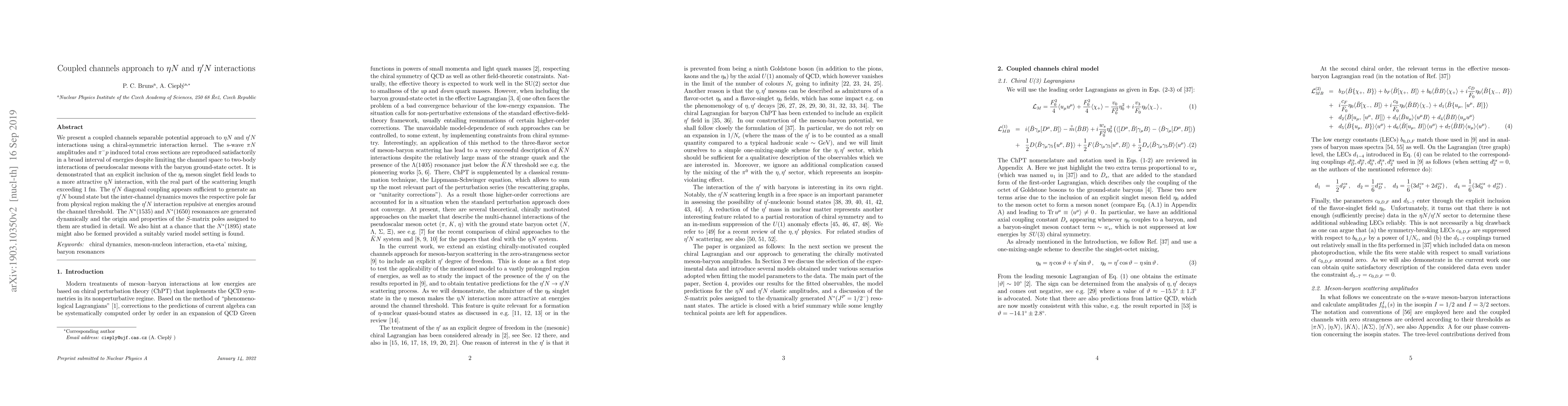 This paper employs a coupled channels approach to study $\eta N$ and $\eta'N$ interactions using a chiral-symmetric potential, successfully reproducing $\pi N$ amplitudes and cross sections. The model suggests a strong $\eta N$ interaction with a scattering length exceeding 1 fm, while the $\eta' N$ interaction is repulsive near the threshold due to inter-channel dynamics.