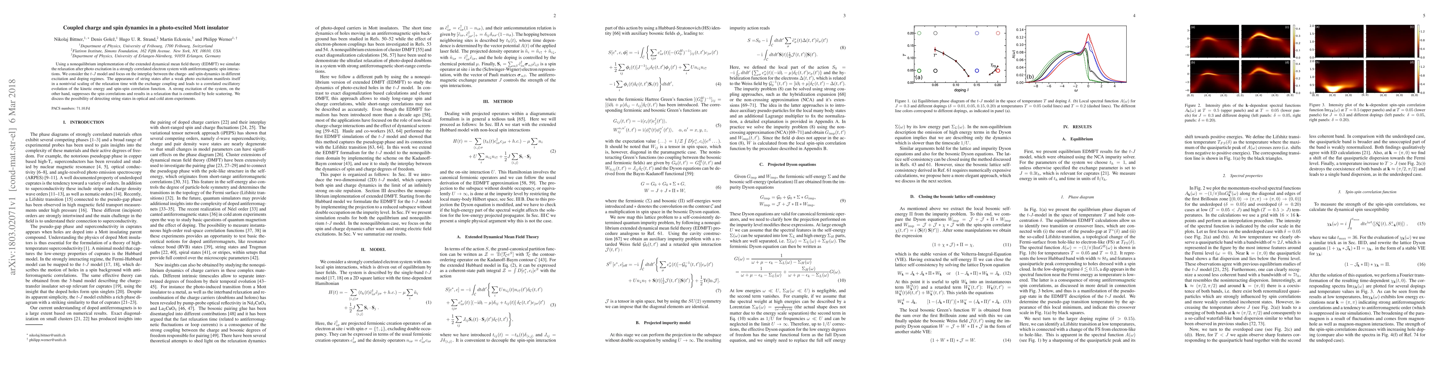 Using a nonequilibrium implementation of the extended dynamical mean field theory (EDMFT) we simulate the relaxation after photo excitation in a strongly correlated electron system with antiferromagnetic spin interactions. We consider the $t$-$J$ model and focus on the interplay between the charge- and spin-dynamics in different excitation and doping regimes. The appearance of string states after a weak photo excitation manifests itself in a nontrivial scaling of the relaxation time with the exchange coupling and leads to a correlated oscillatory evolution of the kinetic energy and spin-spin correlation function. A strong excitation of the system, on the other hand, suppresses the spin correlations and results in a relaxation that is controlled by hole scattering. We discuss the possibility of detecting string states in optical and cold atom experiments.