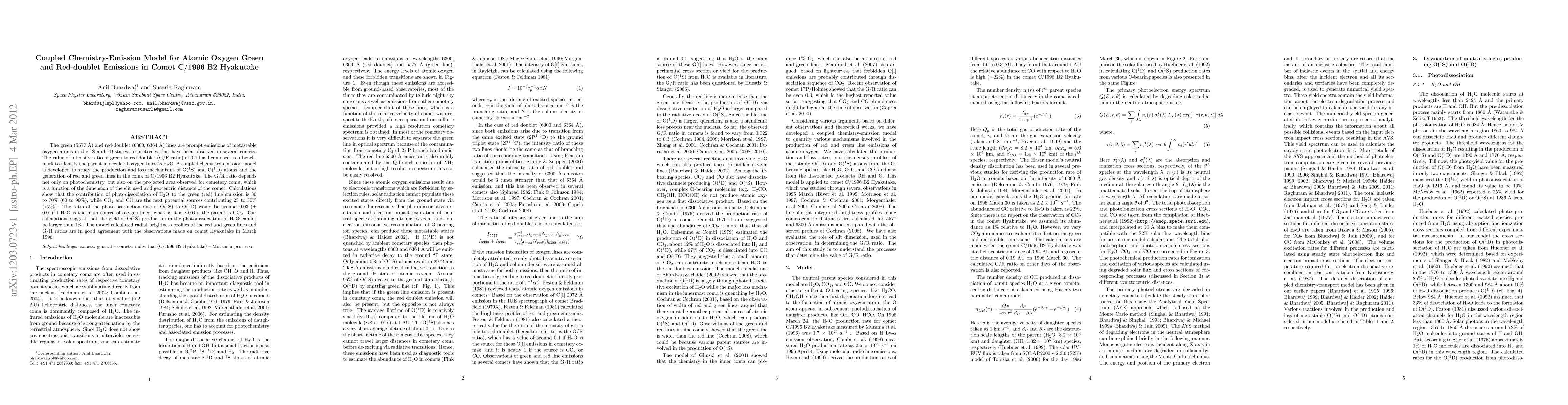 The green (5577 \AA) and red-doublet (6300, 6364 \AA) lines are prompt emissions of metastable oxygen atoms in the $^1$S and $^1$D states, respectively, that have been observed in several comets. The value of intensity ratio of green to red-doublet (G/R ratio) of 0.1 has been used as a benchmark to identify the parent molecule of oxygen lines as H$_2$O. A coupled chemistry-emission model is developed to study the production and loss mechanisms of O($^1$S) and O($^1$D) atoms and the generation of red and green lines in the coma of C/1996 B2 Hyakutake. The G/R ratio depends not only on photochemistry, but also on the projected area observed for cometary coma, which is a function of the dimension of the slit used and geocentric distance of the comet. Calculations show that the contribution of photodissociation of H$_2$O to the green (red) line emission is 30 to 70% (60 to 90%), while CO$_2$ and CO are the next potential sources contributing 25 to 50% ($<$5%). The ratio of the photo-production rate of O($^1$S) to O($^1$D) would be around 0.03 ($\pm$ 0.01) if H$_2$O is the main source of oxygen lines, whereas it is $\sim$0.6 if the parent is CO$_2$. Our calculations suggest that the yield of O($^1$S) production in the photodissociation of H$_2$O cannot be larger than 1%. The model calculated radial brightness profiles of the red and green lines and G/R ratios are in good agreement with the observations made on comet Hyakutake in March 1996.