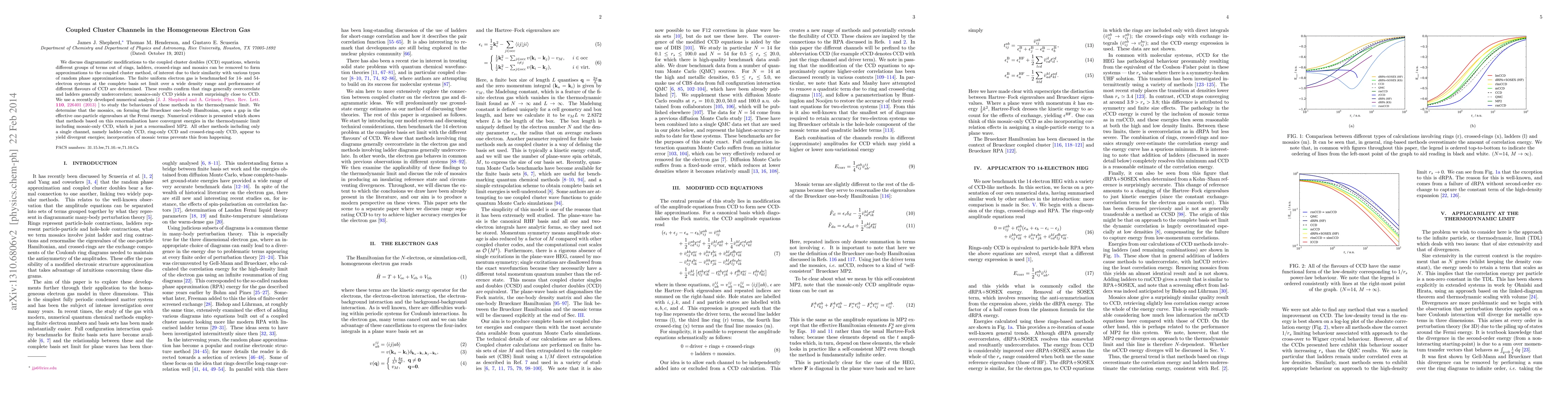 This paper explores modifications to the coupled cluster doubles (CCD) method by removing different groups of terms (rings, ladders, crossed-rings, mosaics) to form various approximations. Benchmarking on finite uniform electron gas systems shows that mosaics-only CCD yields results close to full CCD, while rings overcorrelate and ladders undercorrelate. Numerical analysis reveals that mosaics open a gap in the effective one-particle eigenvalues, leading to convergent energies in the thermodynamic limit, unlike single-channel methods.