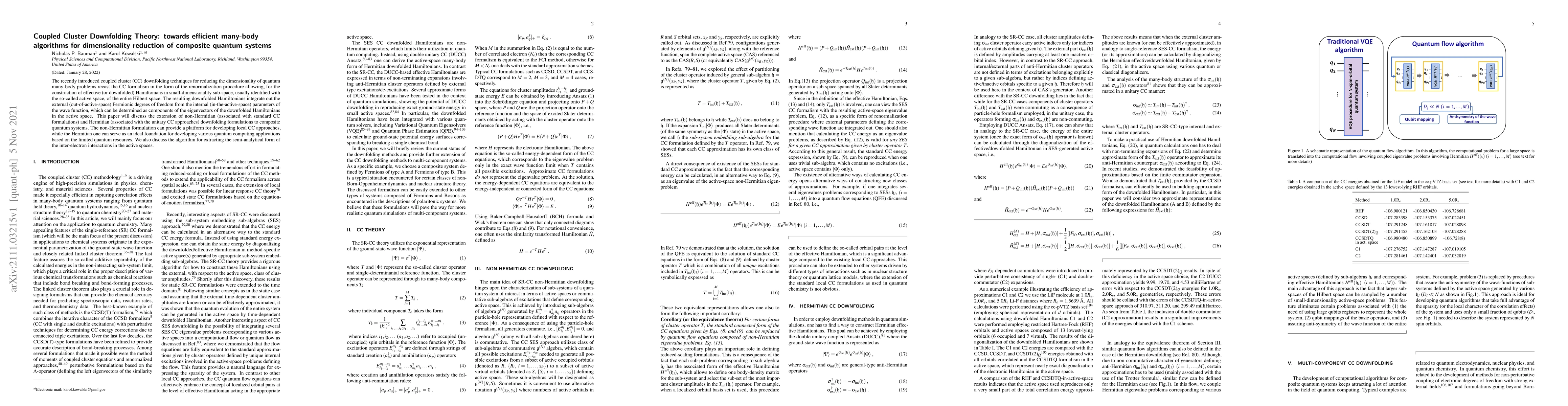 The recently introduced coupled cluster (CC) downfolding techniques for reducing the dimensionality of quantum many-body problems recast the CC formalism in the form of the renormalization procedure allowing, for the construction of effective (or downfolded) Hamiltonians in small-dimensionality sub-space, usually identified with the so-called active space, of the entire Hilbert space. The resulting downfolded Hamiltonians integrate out the external (out-of-active-space) Fermionic degrees of freedom from the internal (in-the-active-space) parameters of the wave function, which can be determined as components of the eigenvectors of the downfolded Hamiltonians in the active space. This paper will discuss the extension of non-Hermitian (associated with standard CC formulations) and Hermitian (associated with the unitary CC approaches) downfolding formulations to composite quantum systems. The non-Hermitian formulation can provide a platform for developing local CC approaches, while the Hermitian one can serve as an ideal foundation for developing various quantum computing applications based on the limited quantum resources. We also discuss the algorithm for extracting the semi-analytical form of the inter-electron interactions in the active spaces.
