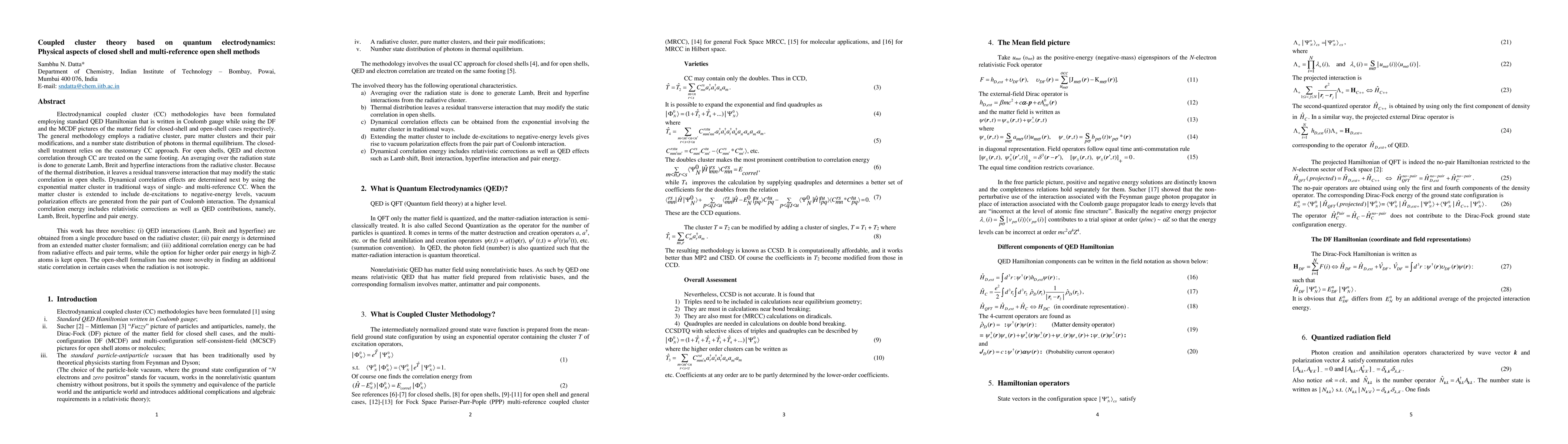 This paper develops a coupled cluster theory based on quantum electrodynamics (QED) for both closed-shell and multi-reference open-shell systems. It introduces a novel methodology that integrates QED interactions from a radiative cluster, extends matter cluster formalism for pair energy, and includes vacuum polarization effects from negative-energy level de-excitations.