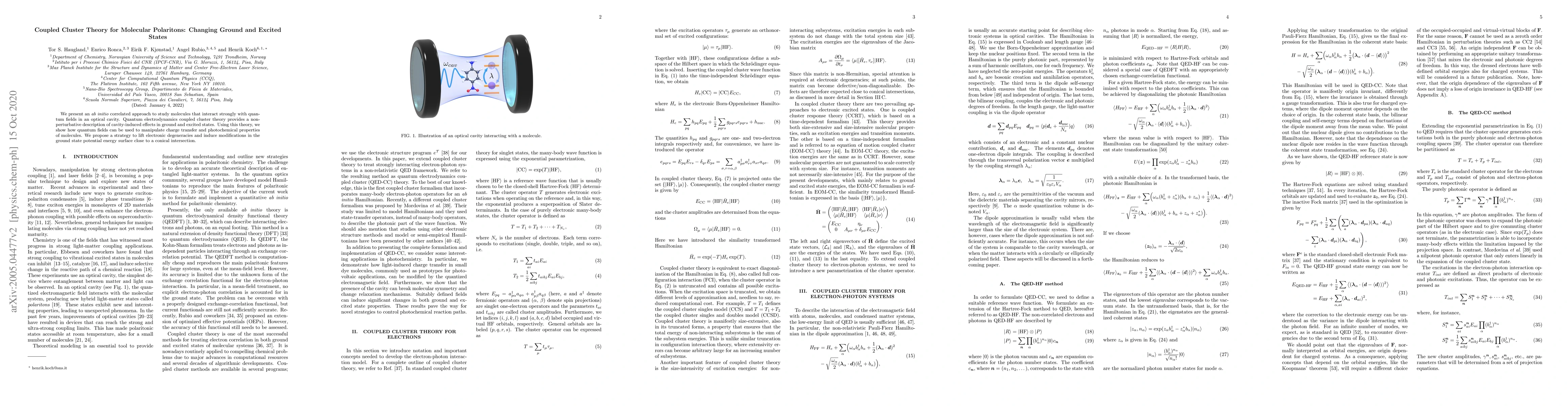 This paper introduces an ab initio coupled cluster theory to study molecular polaritons in optical cavities, offering a non-perturbative method to describe cavity-induced effects on both ground and excited states. The approach demonstrates how quantum fields can manipulate charge transfer and photochemical properties, proposing a strategy to resolve electronic degeneracies and modify the ground state potential energy surface near conical intersections.