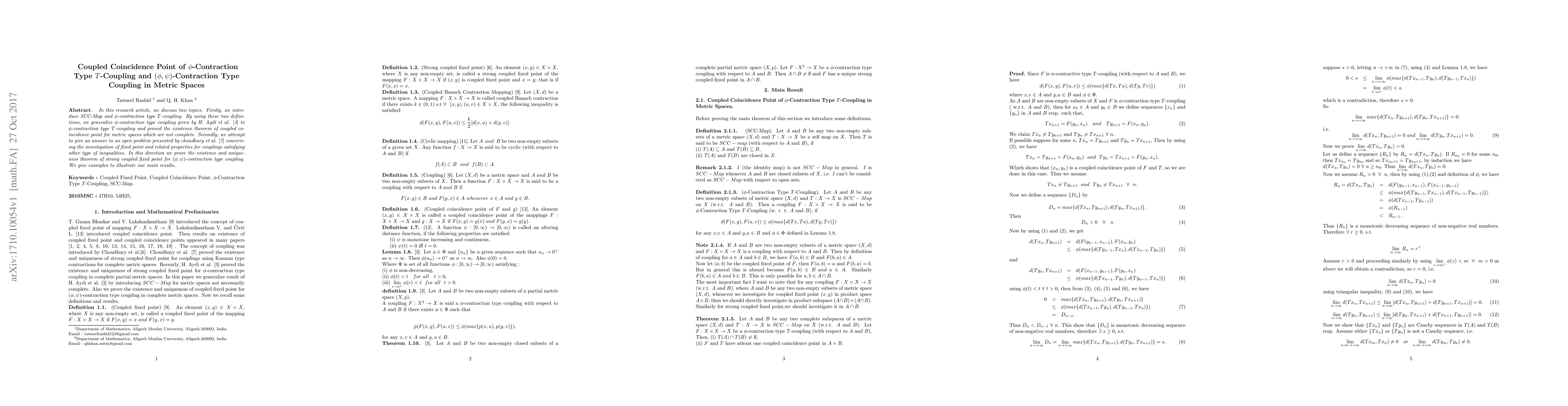 In this research article, we discuss two topics. Firstly, we introduce SCC-Map and $\phi$-contraction type $T$-coupling. By using these two definitions, we generalize $\phi$-contraction type coupling given by H. Aydi et al. [3] to $\phi$-contraction type $T$-coupling and proved the existence theorem of coupled coincidence point for metric spaces which are not complete. Secondly, we attempt to give an answer to an open problem presented by choudhury et al. [7] concerning the investigation of fixed point and related properties for couplings satisfying other type of inequalities. In this direction we prove the existence and uniqueness theorem of strong coupled fixed point for $(\phi,\psi)$-contraction type coupling. We give examples to illustrate our main results.