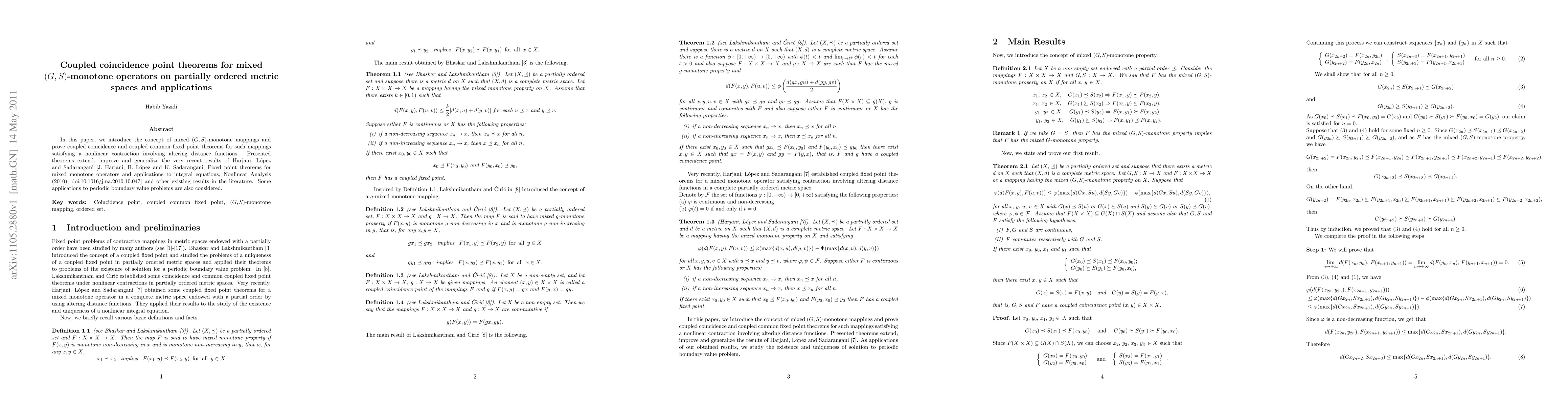 This paper establishes coupled coincidence and common fixed point theorems for mixed (G, S)-monotone operators in partially ordered metric spaces, extending recent results by Harjani, López, and Sadarangani. Applications to periodic boundary value problems are also discussed.