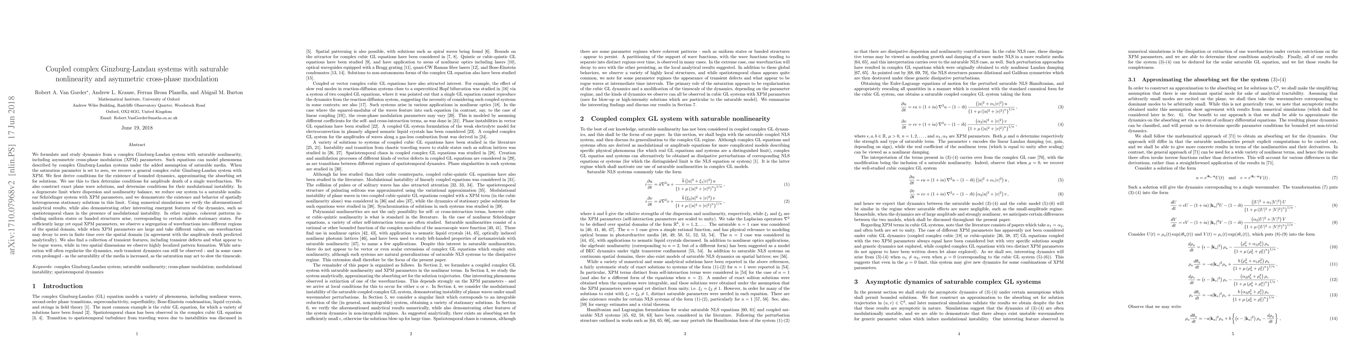 This paper studies the dynamics of a complex Ginzburg-Landau system with saturable nonlinearity and asymmetric cross-phase modulation, deriving conditions for bounded dynamics, amplitude death, and modulational instability. Numerical simulations reveal spatiotemporal chaos and coherent patterns, with segregation of wavefunctions and potential decay to zero under certain conditions.