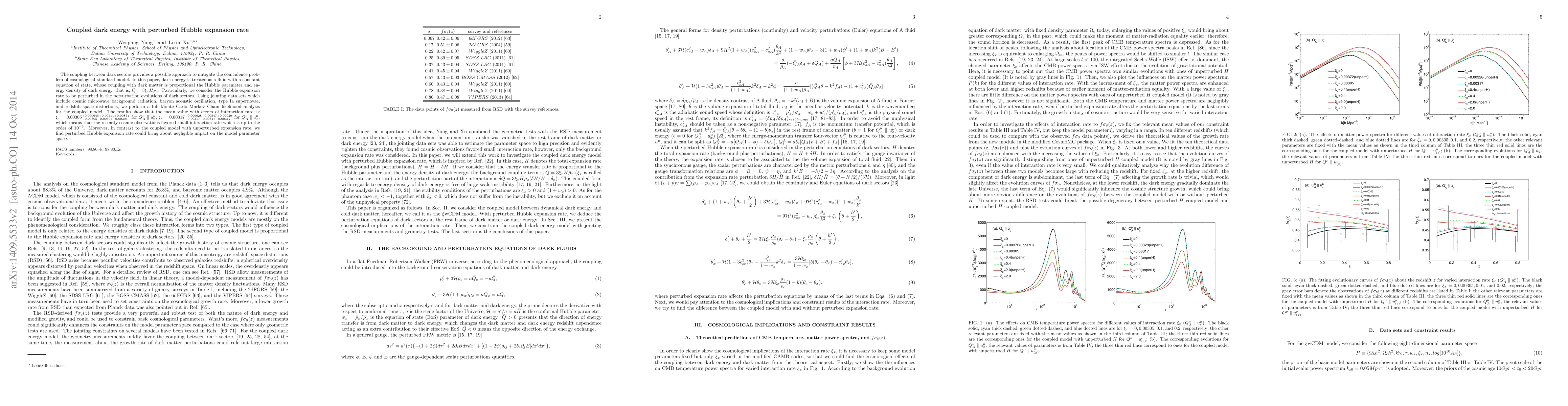 The coupling between dark sectors provides a possible approach to mitigate the coincidence problem of cosmological standard model. In this paper, dark energy is treated as a fluid with a constant equation of state, whose coupling with dark matter is proportional the Hubble parameter and energy density of dark energy, that is, $\bar{Q}=3\xi_x\bar{H}\bar{\rho}_x$. Particularly, we consider the Hubble expansion rate to be perturbed in the perturbation evolutions of dark sectors. Using jointing data sets which include cosmic microwave background radiation, baryon acoustic oscillation, type Ia supernovae, and redshift-space distortions, we perform a full Monte Carlo Markov Chain likelihood analysis for the coupled model. The results show that the mean value with errors of interaction rate is: $\xi_x=0.00305_{-0.00305-0.00305-0.00305}^{+0.000645+0.00511+0.00854}$ for $Q^{\mu}_A\parallel u^{\mu}_c$; $\xi_x=0.00317_{-0.00317-0.00317-0.00317}^{+0.000628+0.00547+0.00929}$ for $Q^{\mu}_A\parallel u^{\mu}_x$, which means that the recently cosmic observations favored small interaction rate which is up to the order of $10^{-3}$. Moreover, in contrast to the coupled model with unperturbed expansion rate, we find perturbed Hubble expansion rate could bring about negligible impact on the model parameter space.