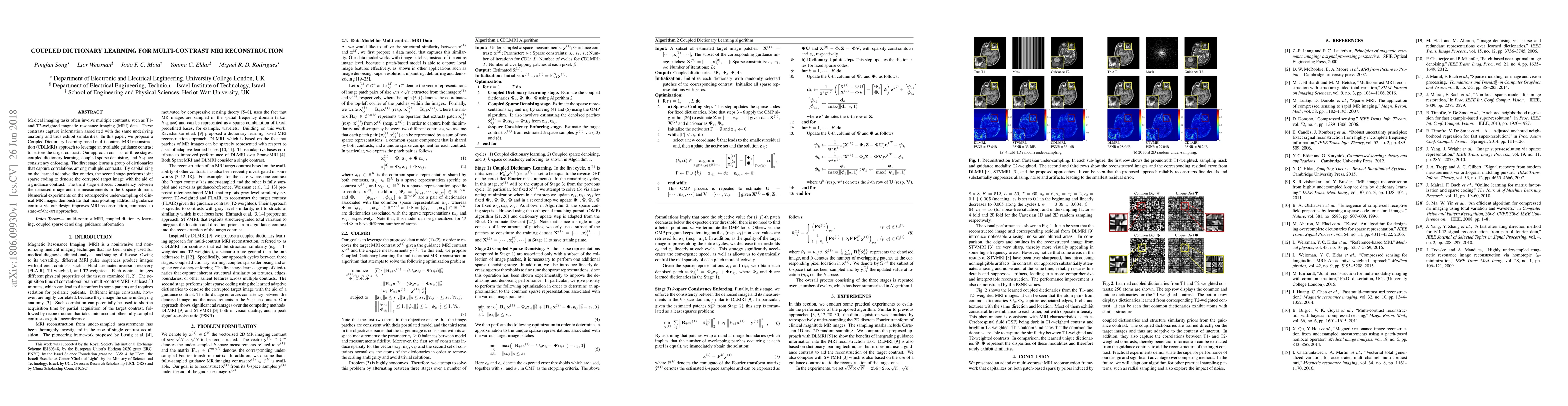 This paper proposes a Coupled Dictionary Learning based approach (CDLMRI) for reconstructing multi-contrast MRI images by leveraging a guidance contrast to enhance target contrast restoration. The method involves dictionary learning, joint sparse coding, and $k$-space consistency enforcement, showing improved reconstruction over existing techniques in clinical MRI data.