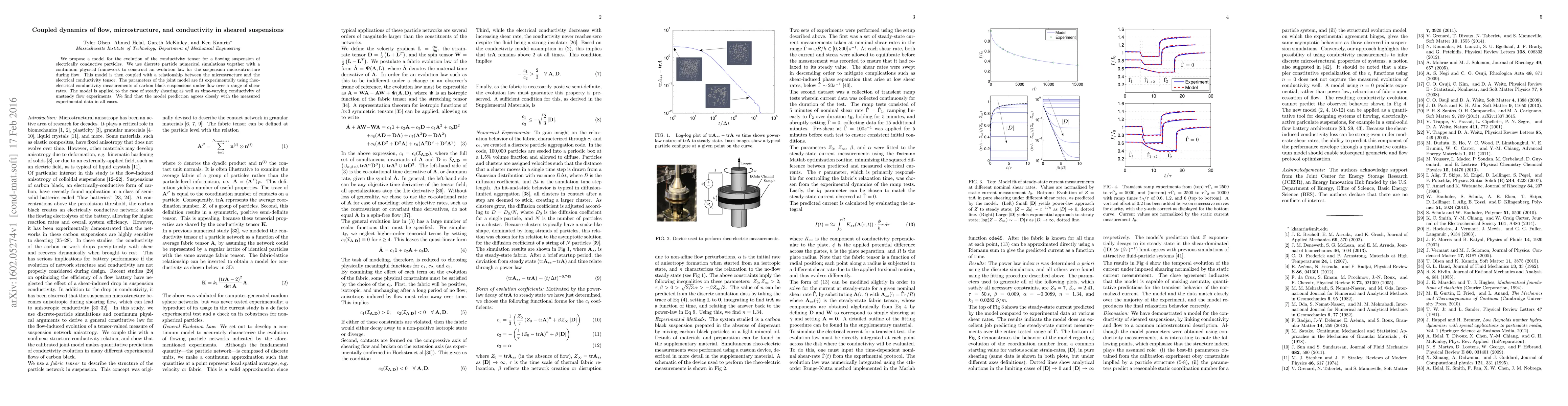 We propose a model for the evolution of the conductivity tensor for a flowing suspension of electrically conductive particles. We use discrete particle numerical simulations together with a continuum physical framework to construct an evolution law for the suspension microsutructure during flow. This model is then coupled with a relationship between the microstructure and the electrical conductivity tensor. The parameters of the joint model are fit experimentally using rheo- electrical conductivity measurements of carbon black suspensions under flow over a range of shear rates. The model is applied to the case of steady shearing as well as time-varying conductivity of unsteady flow experiments. We find that the model prediction agrees closely with the measured experimental data in all cases.