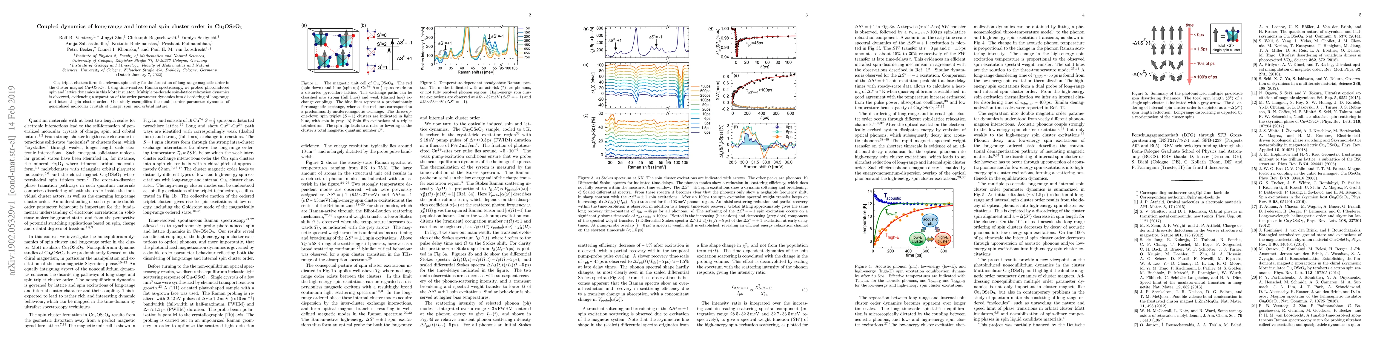 Cu$_4$ triplet clusters form the relevant spin entity for the formation of long-range magnetic order in the cluster magnet Cu$_2$OSeO$_3$. Using time-resolved Raman spectroscopy, we probed photoinduced spin and lattice dynamics in this Mott insulator. Multiple ps-decade spin-lattice relaxation dynamics is observed, evidencing a separation of the order parameter dynamics into disordering of long-range and internal spin cluster order. Our study exemplifies the double order parameter dynamics of generalized molecular crystals of charge, spin, and orbital nature.