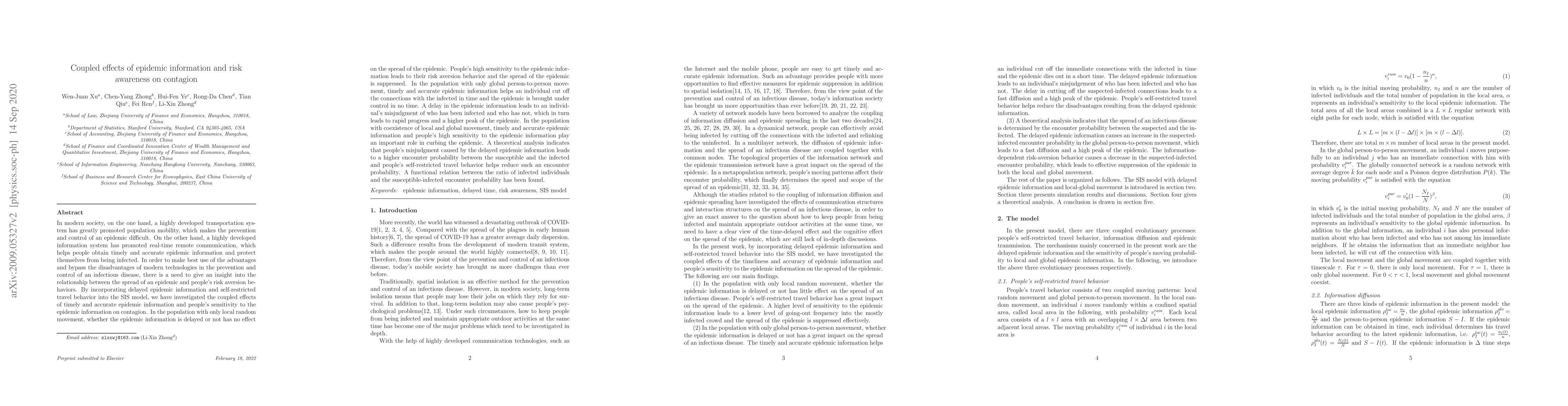 By incorporating delayed epidemic information and self-restricted travel behavior into the SIS model, we have investigated the coupled effects of timely and accurate epidemic information and people's sensitivity to the epidemic information on contagion. In the population with only local random movement, whether the epidemic information is delayed or not has no effect on the spread of the epidemic. People's high sensitivity to the epidemic information leads to their risk aversion behavior and the spread of the epidemic is suppressed. In the population with only global person-to-person movement, timely and accurate epidemic information helps an individual cut off the connections with the infected in time and the epidemic is brought under control in no time. A delay in the epidemic information leads to an individual's misjudgment of who has been infected and who has not, which in turn leads to rapid progress and a higher peak of the epidemic. In the population with coexistence of local and global movement, timely and accurate epidemic information and people's high sensitivity to the epidemic information play an important role in curbing the epidemic. A theoretical analysis indicates that people's misjudgment caused by the delayed epidemic information leads to a higher encounter probability between the susceptible and the infected and people's self-restricted travel behavior helps reduce such an encounter probability. A functional relation between the ratio of infected individuals and the susceptible-infected encounter probability has been found.