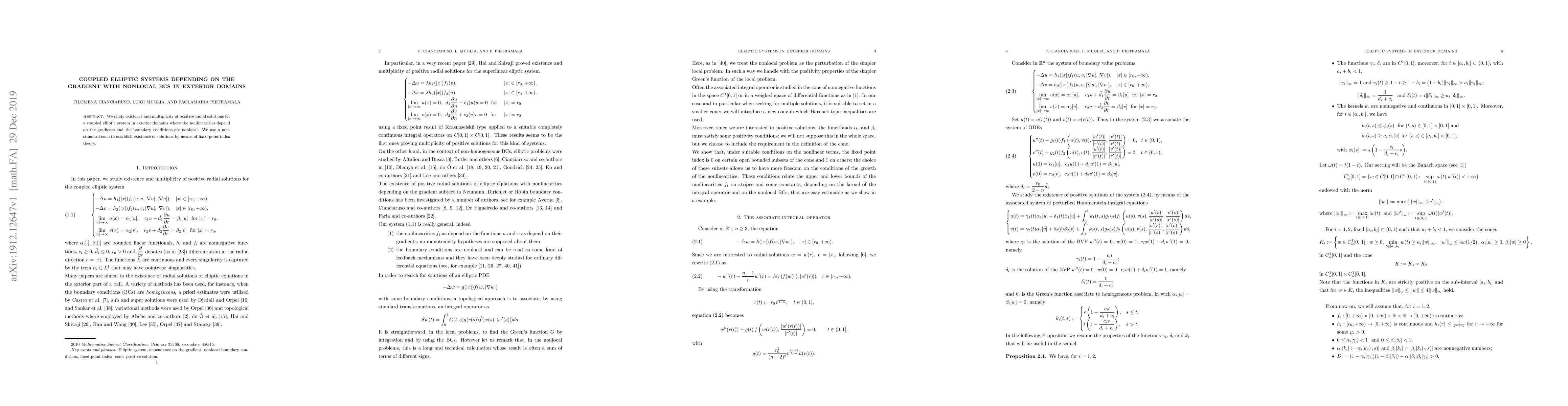 Summary: This paper investigates the existence and multiplicity of positive radial solutions for a coupled elliptic system in exterior domains with gradient-dependent nonlinearities and nonlocal boundary conditions, employing fixed point index theory via a non-standard cone for solution establishment.