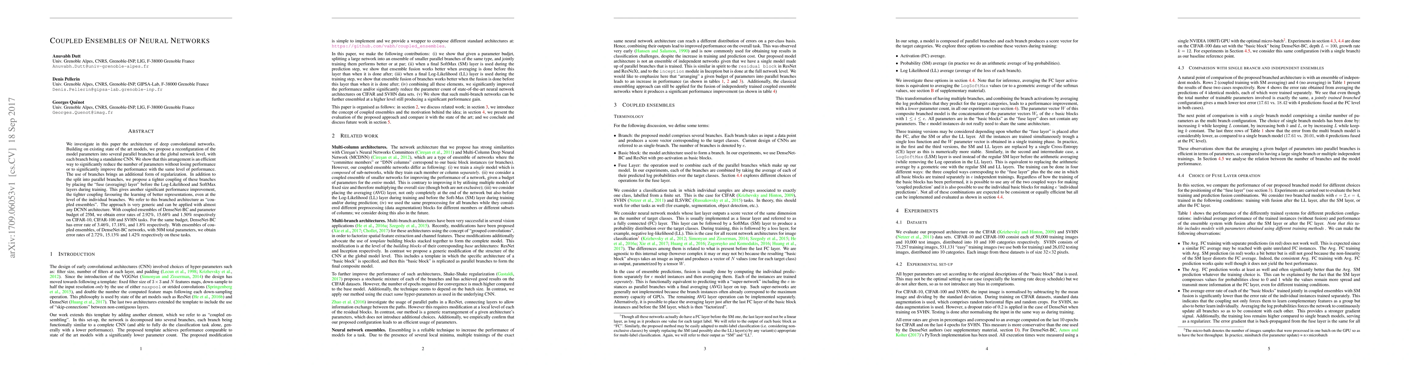 We investigate in this paper the architecture of deep convolutional networks. Building on existing state of the art models, we propose a reconfiguration of the model parameters into several parallel branches at the global network level, with each branch being a standalone CNN. We show that this arrangement is an efficient way to significantly reduce the number of parameters without losing performance or to significantly improve the performance with the same level of performance. The use of branches brings an additional form of regularization. In addition to the split into parallel branches, we propose a tighter coupling of these branches by placing the "fuse (averaging) layer" before the Log-Likelihood and SoftMax layers during training. This gives another significant performance improvement, the tighter coupling favouring the learning of better representations, even at the level of the individual branches. We refer to this branched architecture as "coupled ensembles". The approach is very generic and can be applied with almost any DCNN architecture. With coupled ensembles of DenseNet-BC and parameter budget of 25M, we obtain error rates of 2.92%, 15.68% and 1.50% respectively on CIFAR-10, CIFAR-100 and SVHN tasks. For the same budget, DenseNet-BC has error rate of 3.46%, 17.18%, and 1.8% respectively. With ensembles of coupled ensembles, of DenseNet-BC networks, with 50M total parameters, we obtain error rates of 2.72%, 15.13% and 1.42% respectively on these tasks.
