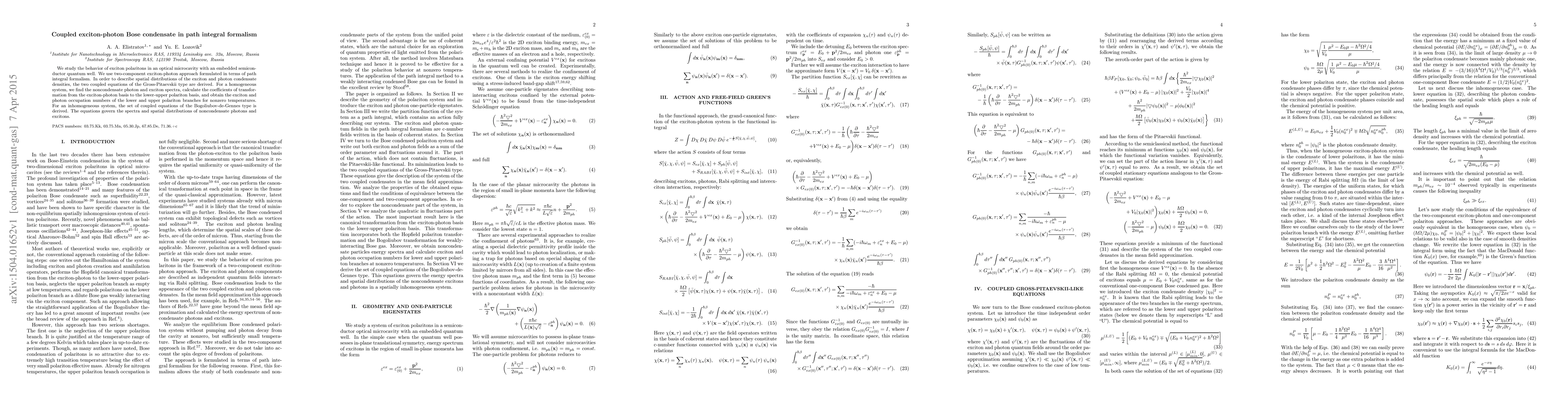 This paper investigates exciton-polariton behavior in optical microcavities using a path integral formalism, deriving Gross-Pitaevskii-type equations for exciton and photon condensate densities. It calculates spectra and occupation numbers for both homogeneous and inhomogeneous systems, employing Bogoliubov-de-Gennes-type equations for the latter.