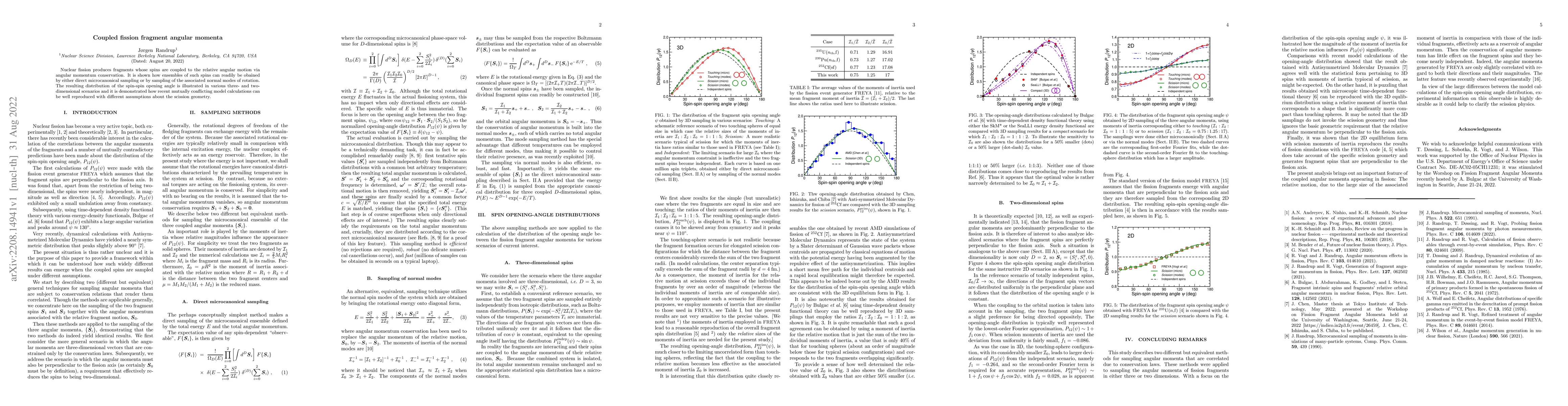 This paper explores the coupling of fission fragment angular momenta through angular momentum conservation, demonstrating how spin ensembles can be obtained via microcanonical sampling or rotational mode sampling. It illustrates the spin-spin opening angle distribution and resolves conflicting model calculations based on different scission geometries.