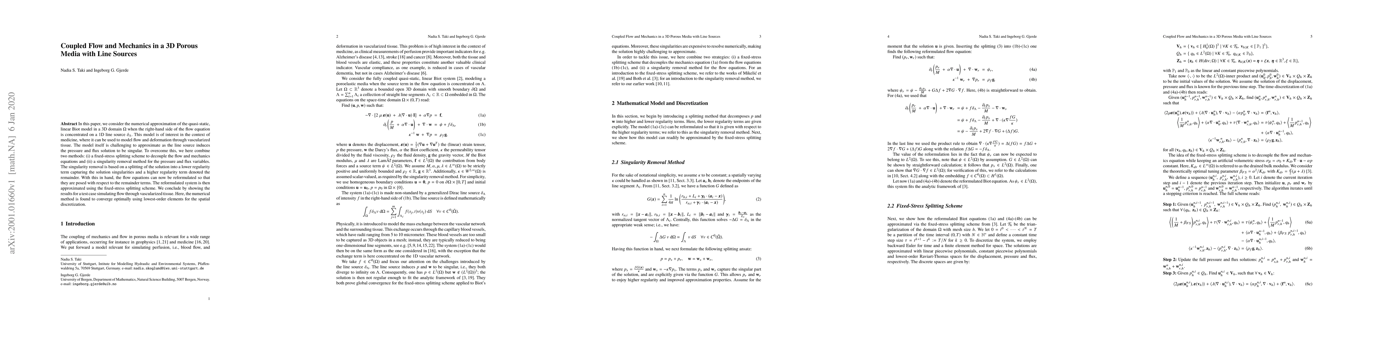 In this paper, we consider the numerical approximation of the quasi-static, linear Biot model in a 3D domain $\Omega$ when the right-hand side of the mass balance equation is concentrated on a 1D line source $\delta_{\Lambda}$. This model is of interest in the context of medicine, where it can be used to model flow and deformation through vascularized tissue. The model itself is challenging to approximate as the line source induces the pressure and flux solution to be singular. To overcome this, we here combine two methods: (i) a fixed-stress splitting scheme to decouple the flow and mechanics equations and (ii) a singularity removal method for the pressure and flux variables. The singularity removal is based on a splitting of the solution into a lower regularity term capturing the solution singularities, and a higher regularity term denoted the remainder. With this in hand, the flow equations can now be reformulated so that they are posed with respect to the remainder terms. The reformulated system is then approximated using the fixed-stress splitting scheme. Finally, we conclude by showing the results for a test case relevant for flow through vascularized tissue. This numerical method is found to converge optimally.