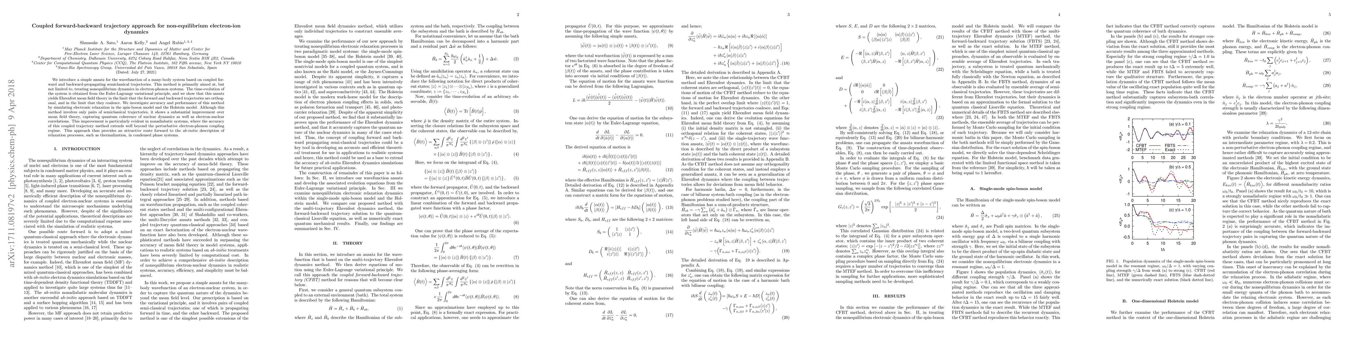 We introduce a simple ansatz for the wavefunction of a many-body system based on coupled forward and backward-propagating semiclassical trajectories. This method is primarily aimed at, but not limited to, treating nonequilibrium dynamics in electron-phonon systems. The time-evolution of the system is obtained from the Euler-Lagrange variational principle, and we show that this ansatz yields Ehrenfest mean field theory in the limit that the forward and backward trajectories are orthogonal, and in the limit that they coalesce. We investigate accuracy and performance of this method by simulating electronic relaxation in the spin-boson model and the Holstein model. Although this method involves only pairs of semiclassical trajectories, it shows a substantial improvement over mean field theory, capturing quantum coherence of nuclear dynamics as well as electron-nuclear correlations. This improvement is particularly evident in nonadiabatic systems, where the accuracy of this coupled trajectory method extends well beyond the perturbative electron-phonon coupling regime. This approach thus provides an attractive route forward to the ab-initio description of relaxation processes, such as thermalization, in condensed phase systems.