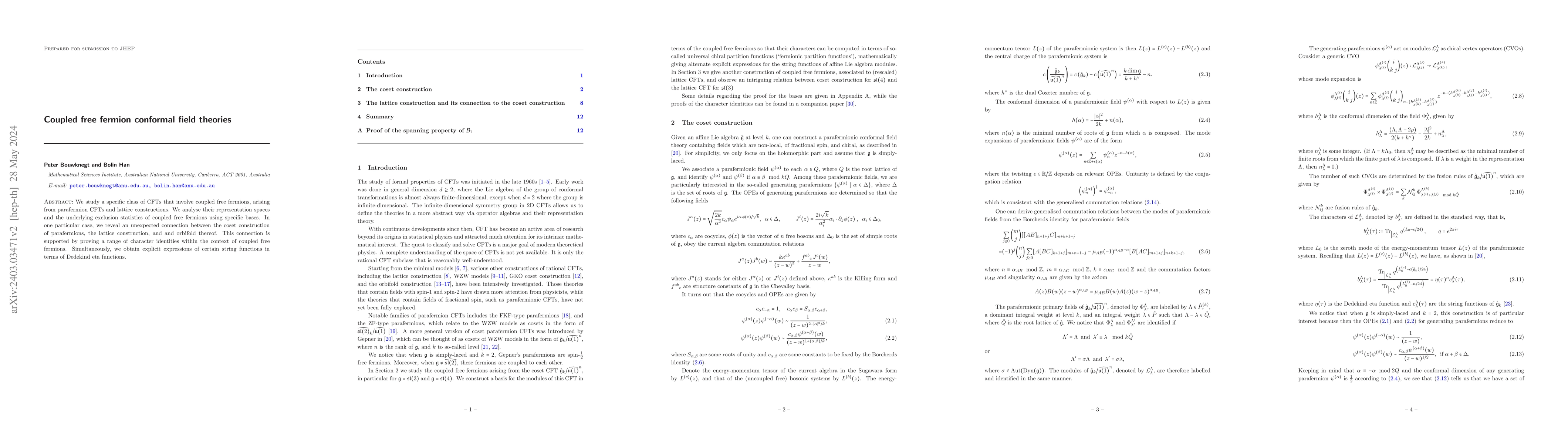 We study a specific class of CFTs that involve coupled free fermions, arising from parafermion CFTs and lattice constructions. We analyse their representation spaces and the underlying exclusion statistics of coupled free fermions using specific bases. In one particular case, we reveal an unexpected connection between the coset construction of parafermions, the lattice construction, and and orbifold thereof. This connection is supported by proving a range of character identities within the context of coupled free fermions. Simultaneously, we obtain explicit expressions of certain string functions in terms of Dedekind eta functions.