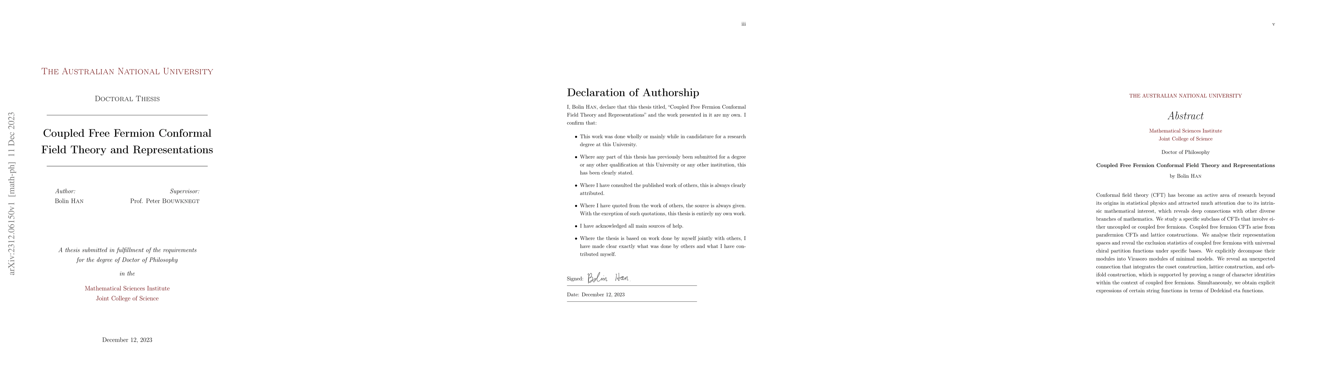 This paper investigates coupled free fermion conformal field theories (CFTs), revealing their representation spaces and exclusion statistics, and establishing connections between coset, lattice, and orbifold constructions. It also provides explicit decompositions into Virasoro modules and character identities, alongside expressions for string functions in terms of Dedekind eta functions.