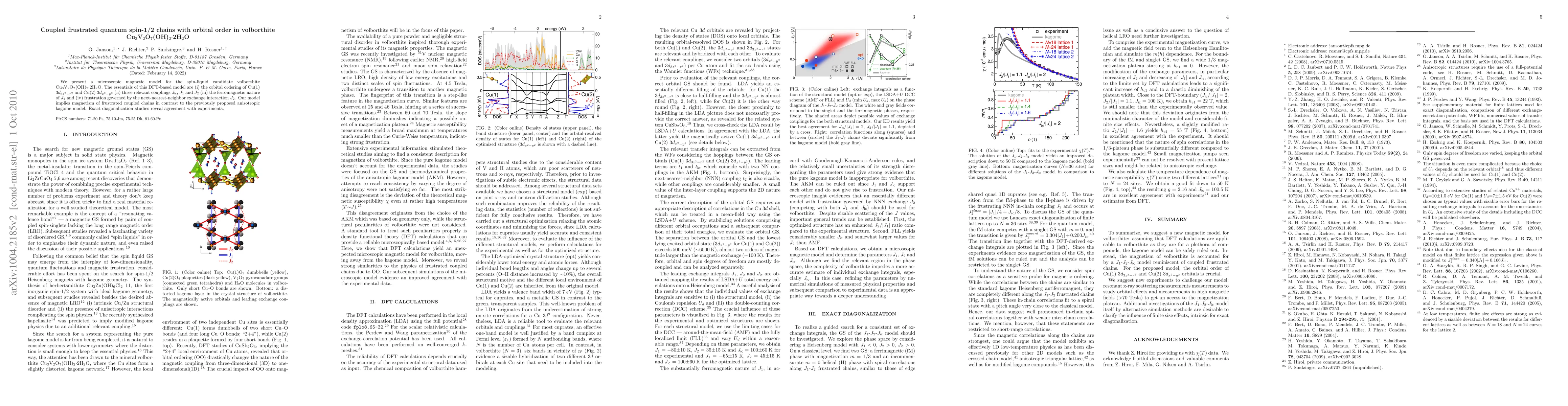 This research proposes a detailed magnetic model for volborthite Cu3V2O7(OH)2(H2O)2, highlighting orbital ordering and frustrated quantum spin-1/2 chains, with ferromagnetic interactions and next-nearest-neighbor exchange, contrasting with previous kagome models, and supported by exact diagonalization studies.