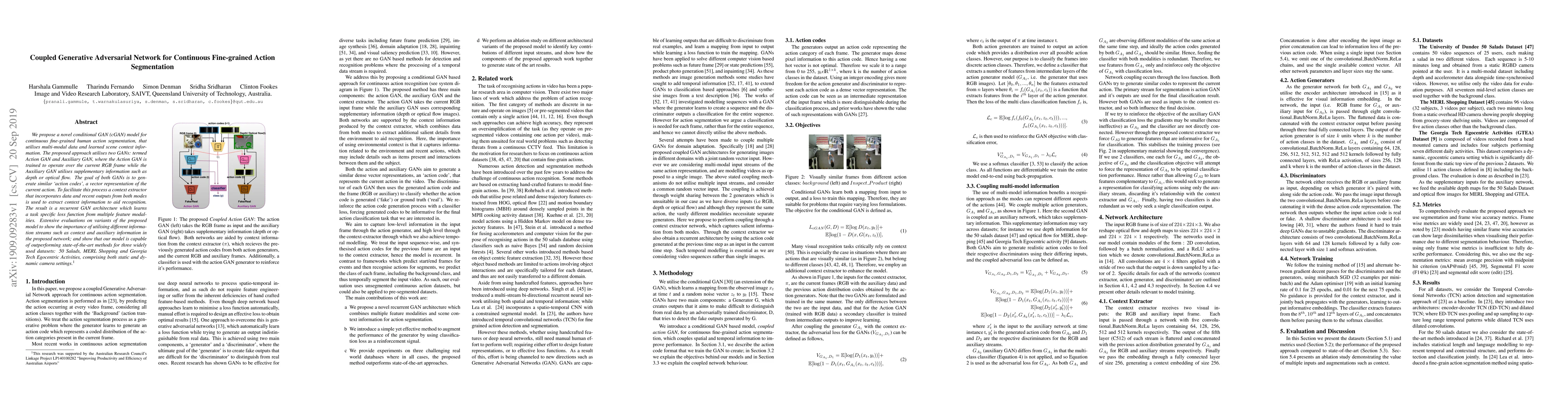 This paper introduces a coupled GAN model for continuous fine-grained human action segmentation, utilizing multi-modal data and context information. The proposed architecture consists of two GANs, Action GAN and Auxiliary GAN, which generate similar action codes, and a context extractor to enhance recognition, achieving superior performance on three datasets.